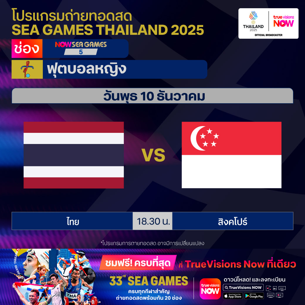 ฟุตบอลหญิง ไทย พบ สิงคโปร์ เวลา 18.30
