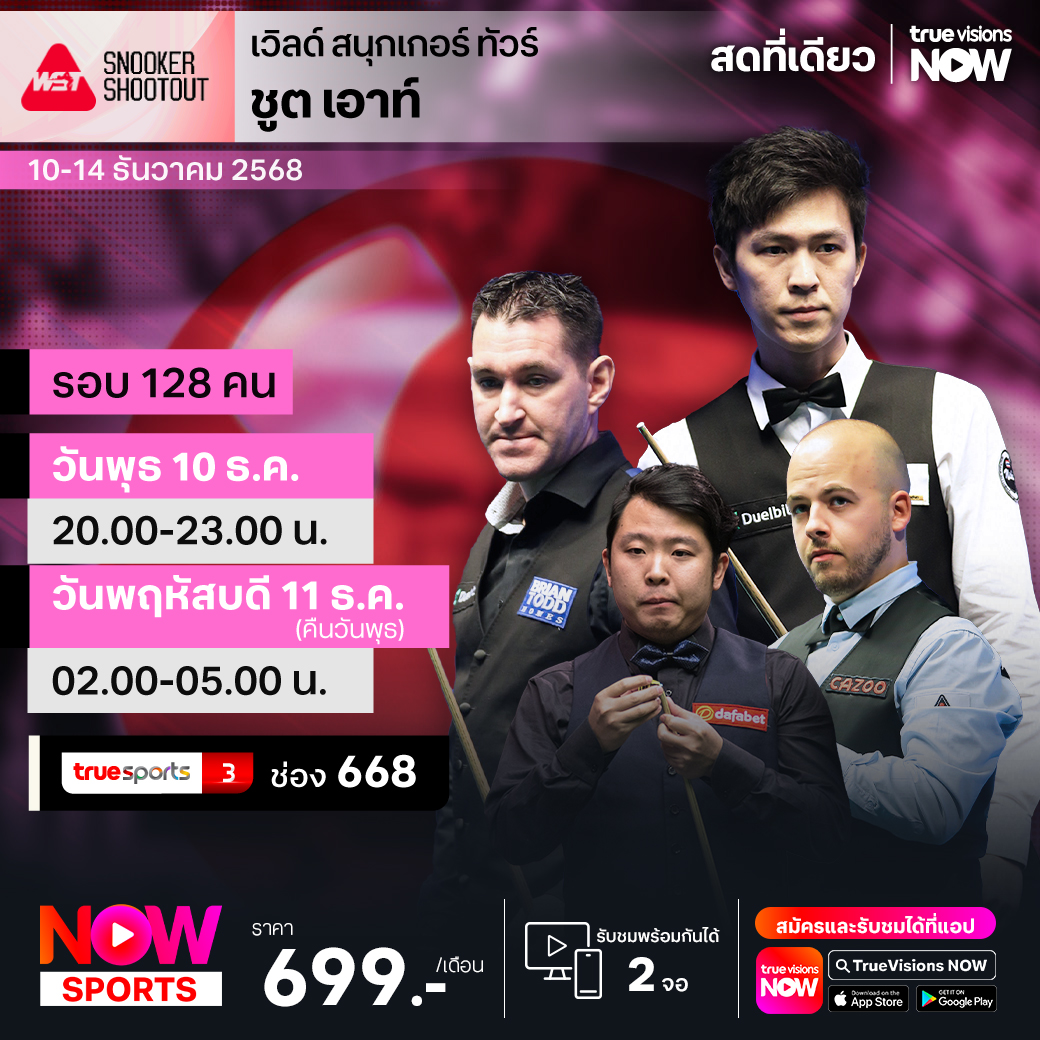 แฟนๆ สนุกเกอร์ ต้องไม่พลาดชมความสนุกตื่นเต้นและเกมการแข่งขันที่มีรูปแบบไม่เหมือนรายการใดๆ กับศึก ชู้ตเอาท์ 2025 ที่ กำหนดกติกาตัดสินแพ้ชนะเฟรมเดียวภายใน 10 นาที การตัดสินใจที่รวดเร็วและความแม่นยำจะเป็นปัจจัยของผู้ชนะ สุดยอดฝีมือของโลก 128 คน สู้เพื่อตำแหน่งแชมเปี้ยนเพียงหนึ่งเดียว จากแบล็คพูล ทาวเวอร์ เซอร์คัส ประเทศอังกฤษ ชมสด เอ็กซ์คลูซีฟ ครบทุกคู่ ที่ ทรูวิชั่นส์