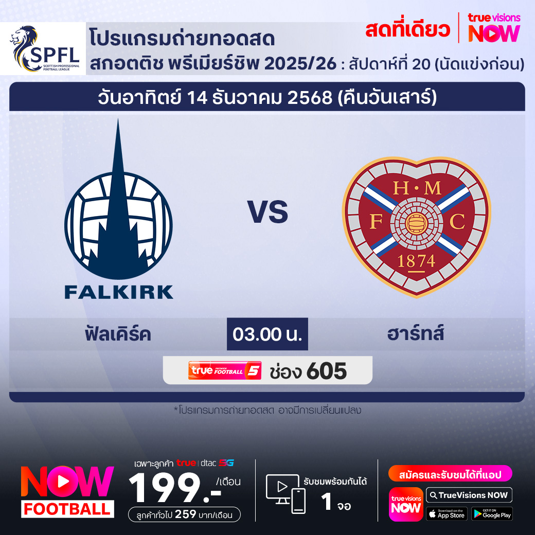 Falkirk vs Heart of Midlothian เวลา 03.00-05.00 ทางช่องTPF 5(605)