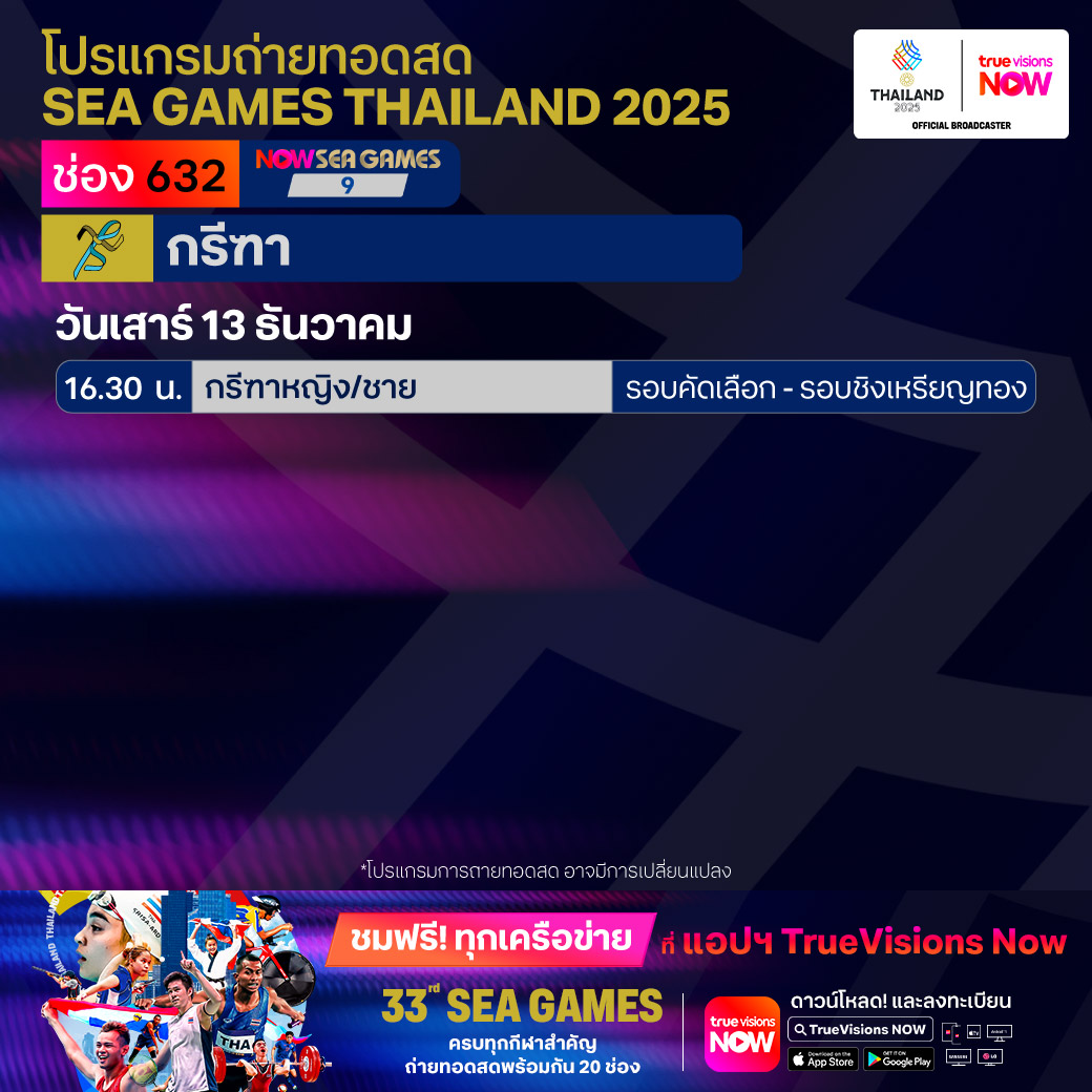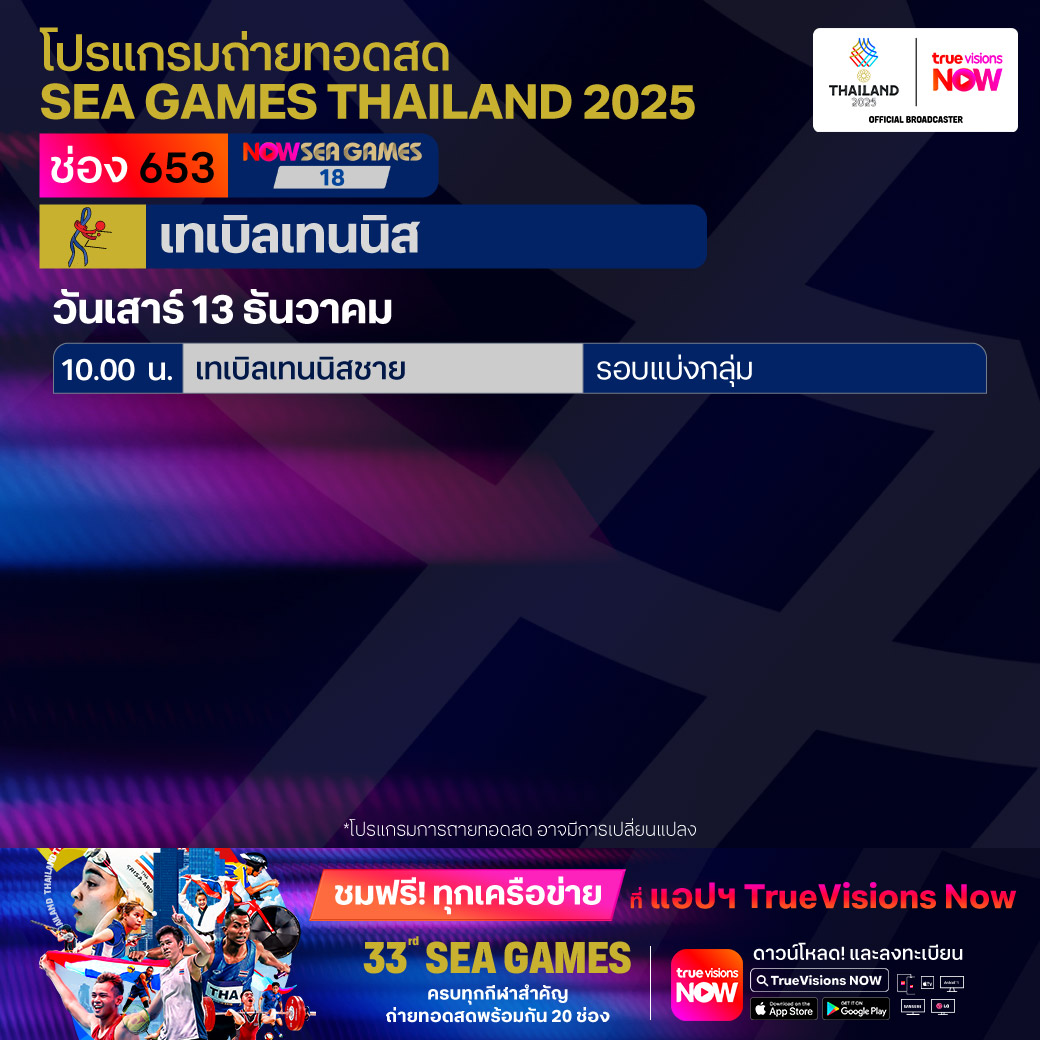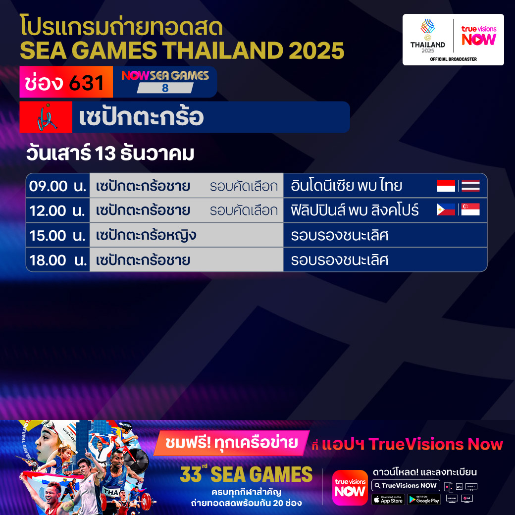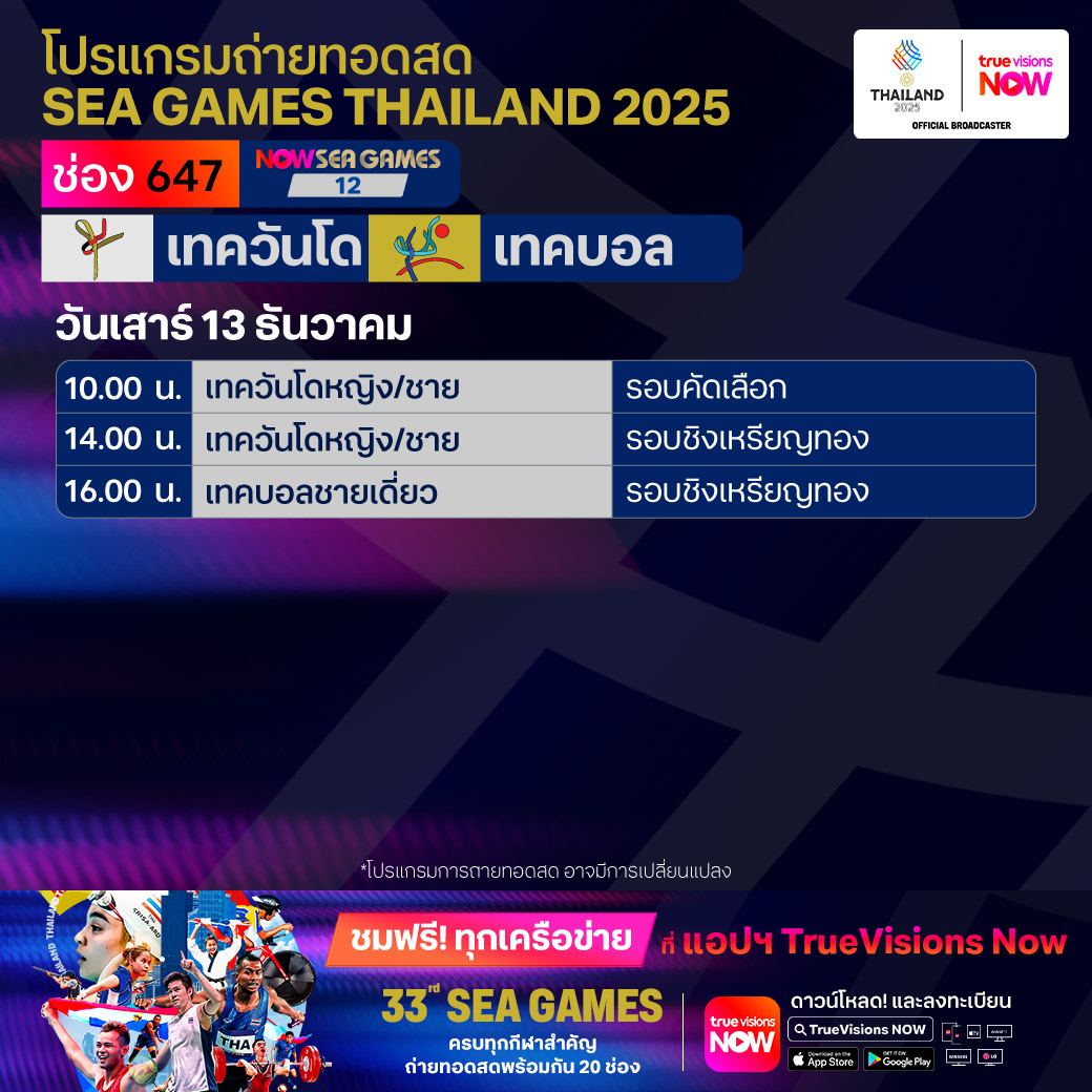 วันนี้มีอะไรดูที่ ทรูวิชั่นส์ ประจำวันเสาร์ที่ 13 ธันวาคม 68 ยังคงมีกีฬาที่น่าสนใจให้ได้ตามลุ้นตามเชียร์กันเหมือนเดิม โดยในส่วนของฟุตบอลนั้นยังมีศึก ลา ลีกา สเปน, บุนเดสลีกา เยอรมนี, กัลโช่ เซเรีย อา อิตาลี และ สกอตติช พรีเมียร์ชิพ ให้ได้ตามเชียร์กันต่อ ส่วนกีฬาซีเกมส์ 2025 ยังมีถ่ายทอดสดหลายชนิดกีฬาให้ได้ติดตามกัน นอกจากนี้กีฬาอื่นๆ ยังมี กอล์ฟ ดีพี เวิลด์ ทัวร์ รายการ อัลเฟร็ด ดันฮิลล์ แชมเปี้ยนชิพ, กอล์ฟ พีจีเอ แกรนท์ ธอร์นตัน อินวิเตชั่น, เวิลด์ สนุกเกอร์ ทัวร์ รายการ ชู้ตเอาท์ และ วอลเลย์บอล วี-ลีก งานนี้ ทรูวิชั่นส์ จัดเต็มให้ชมกันถึงบ้าน