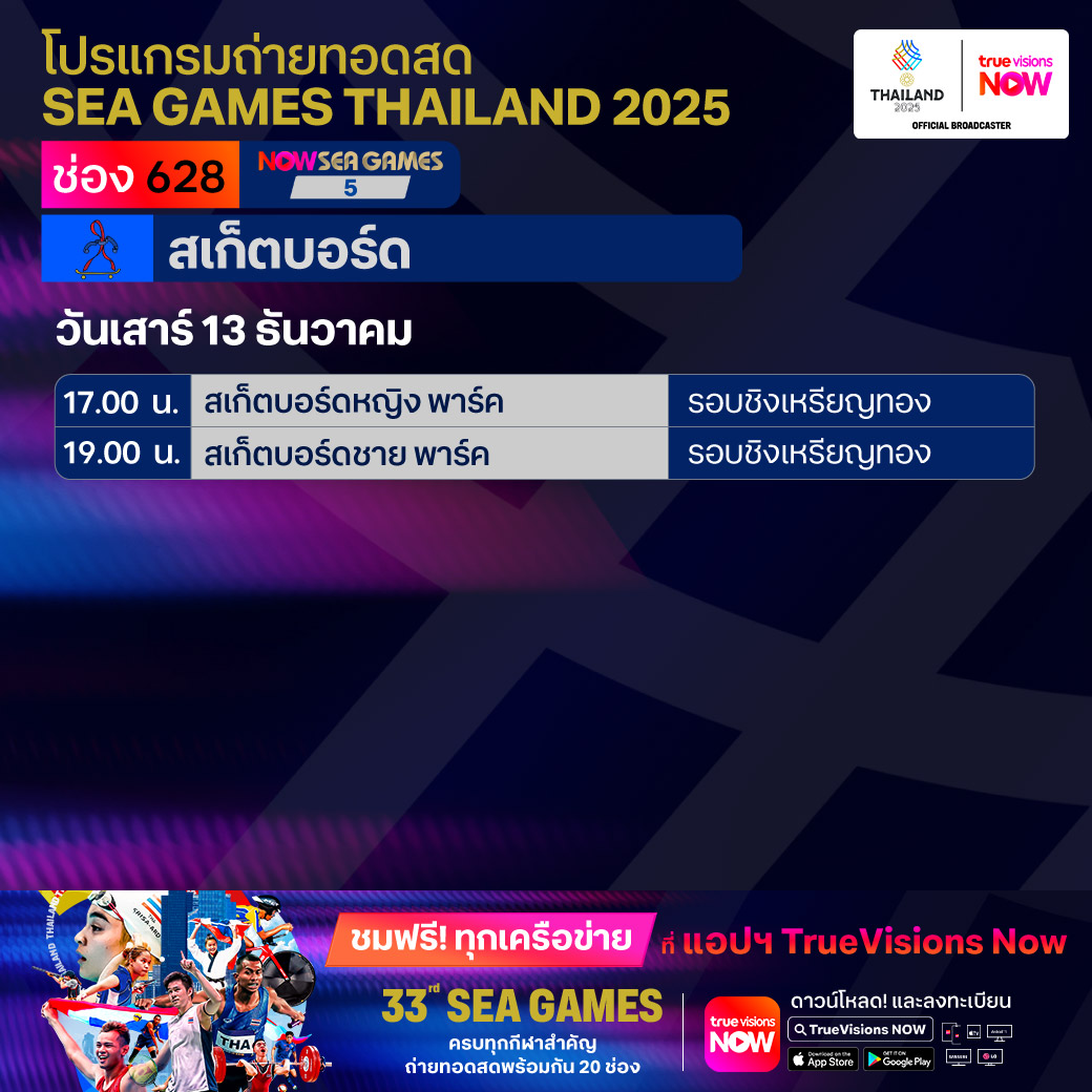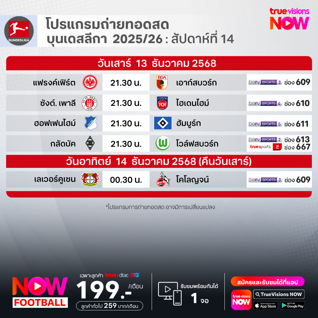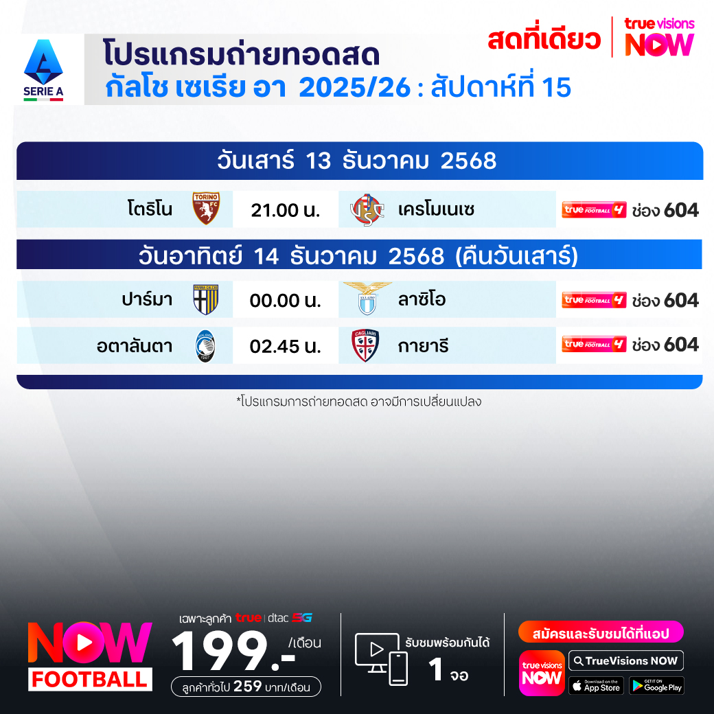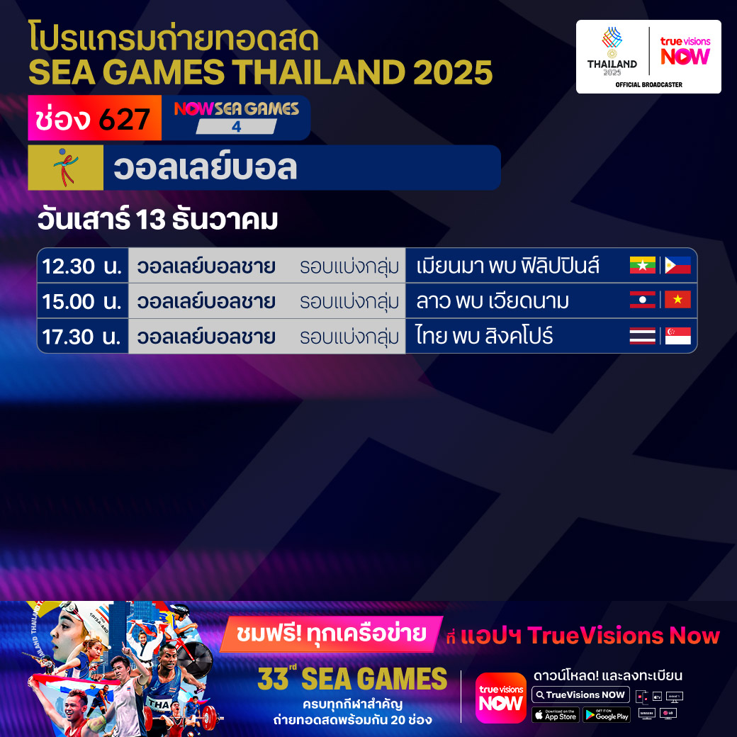 วันนี้มีอะไรดูที่ ทรูวิชั่นส์ ประจำวันเสาร์ที่ 13 ธันวาคม 68 ยังคงมีกีฬาที่น่าสนใจให้ได้ตามลุ้นตามเชียร์กันเหมือนเดิม โดยในส่วนของฟุตบอลนั้นยังมีศึก ลา ลีกา สเปน, บุนเดสลีกา เยอรมนี, กัลโช่ เซเรีย อา อิตาลี และ สกอตติช พรีเมียร์ชิพ ให้ได้ตามเชียร์กันต่อ ส่วนกีฬาซีเกมส์ 2025 ยังมีถ่ายทอดสดหลายชนิดกีฬาให้ได้ติดตามกัน นอกจากนี้กีฬาอื่นๆ ยังมี กอล์ฟ ดีพี เวิลด์ ทัวร์ รายการ อัลเฟร็ด ดันฮิลล์ แชมเปี้ยนชิพ, กอล์ฟ พีจีเอ แกรนท์ ธอร์นตัน อินวิเตชั่น, เวิลด์ สนุกเกอร์ ทัวร์ รายการ ชู้ตเอาท์ และ วอลเลย์บอล วี-ลีก งานนี้ ทรูวิชั่นส์ จัดเต็มให้ชมกันถึงบ้าน