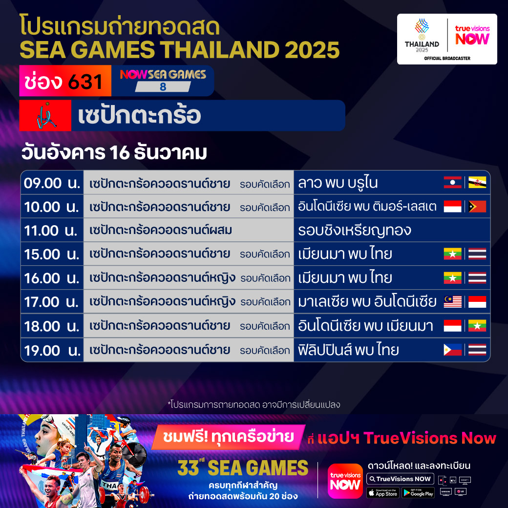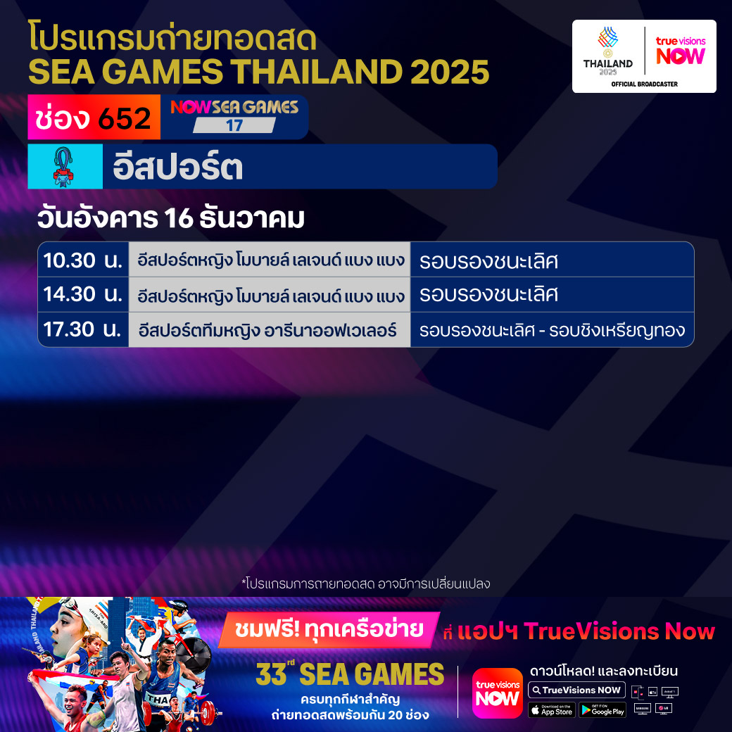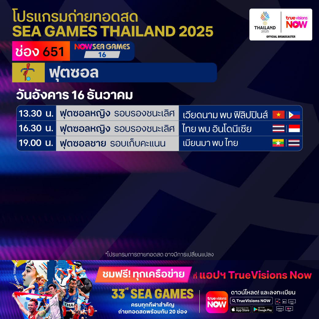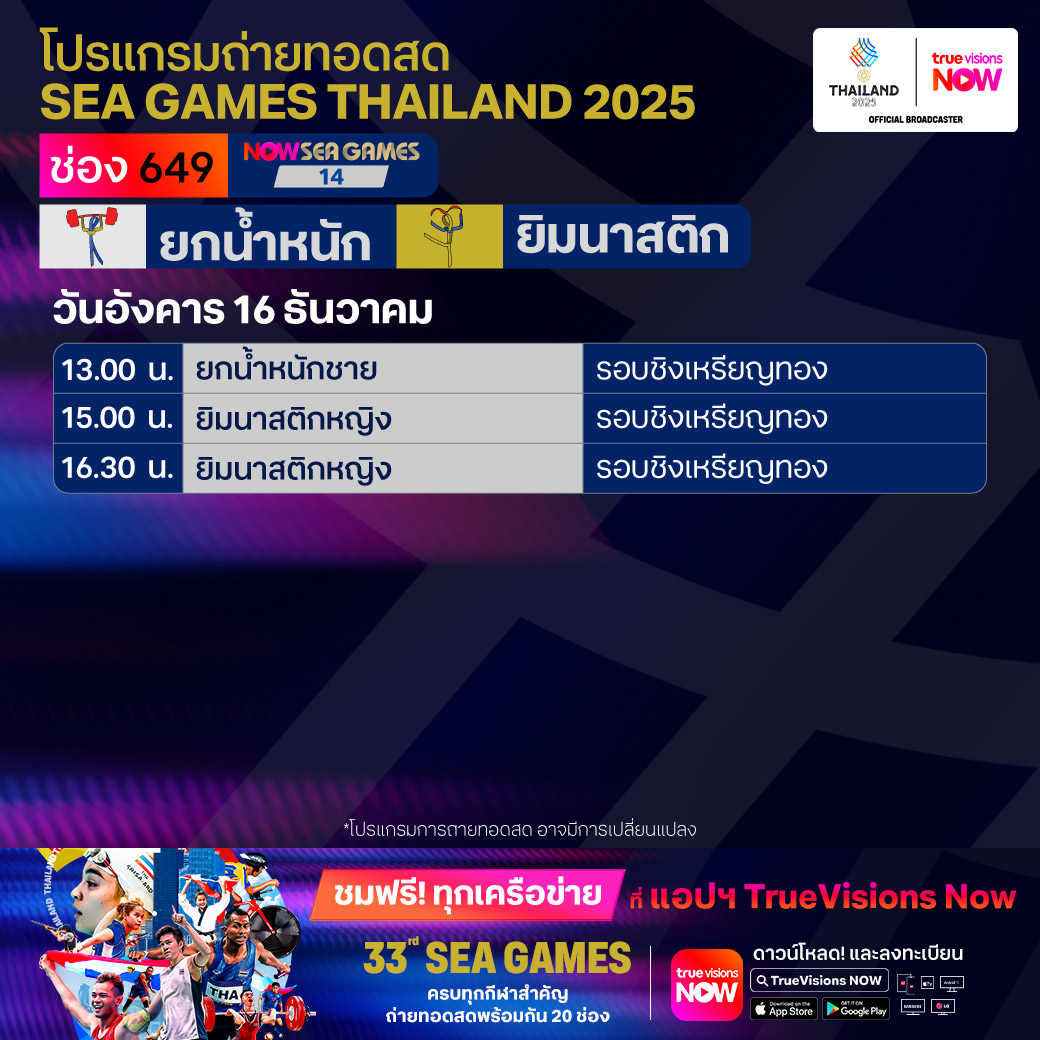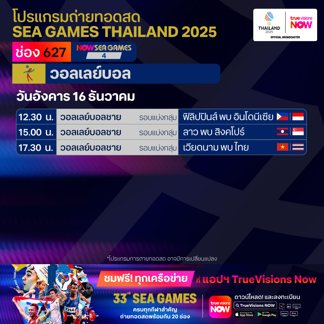 วันนี้มีอะไรดูที่ ทรูวิชั่นส์ ประจำวันอังคารที่ 16 ธันวาคม 68 ยังคงมีกีฬาที่น่าสนใจให้ได้ตามลุ้นตามเชียร์กันเหมือนเดิม โดยในส่วนของกีฬาซีเกมส์ 2025 ยังมีถ่ายทอดสดหลายชนิดกีฬาให้ได้ติดตามกัน นอกจากนี้กีฬาอื่นๆ ยังมี เวิลด์ สนุกเกอร์ ทัวร์ รายการ สกอตติช โอเพ่น และ วอลเลย์บอล วี-ลีก งานนี้ ทรูวิชั่นส์ จัดเต็มให้ชมกันถึงบ้าน