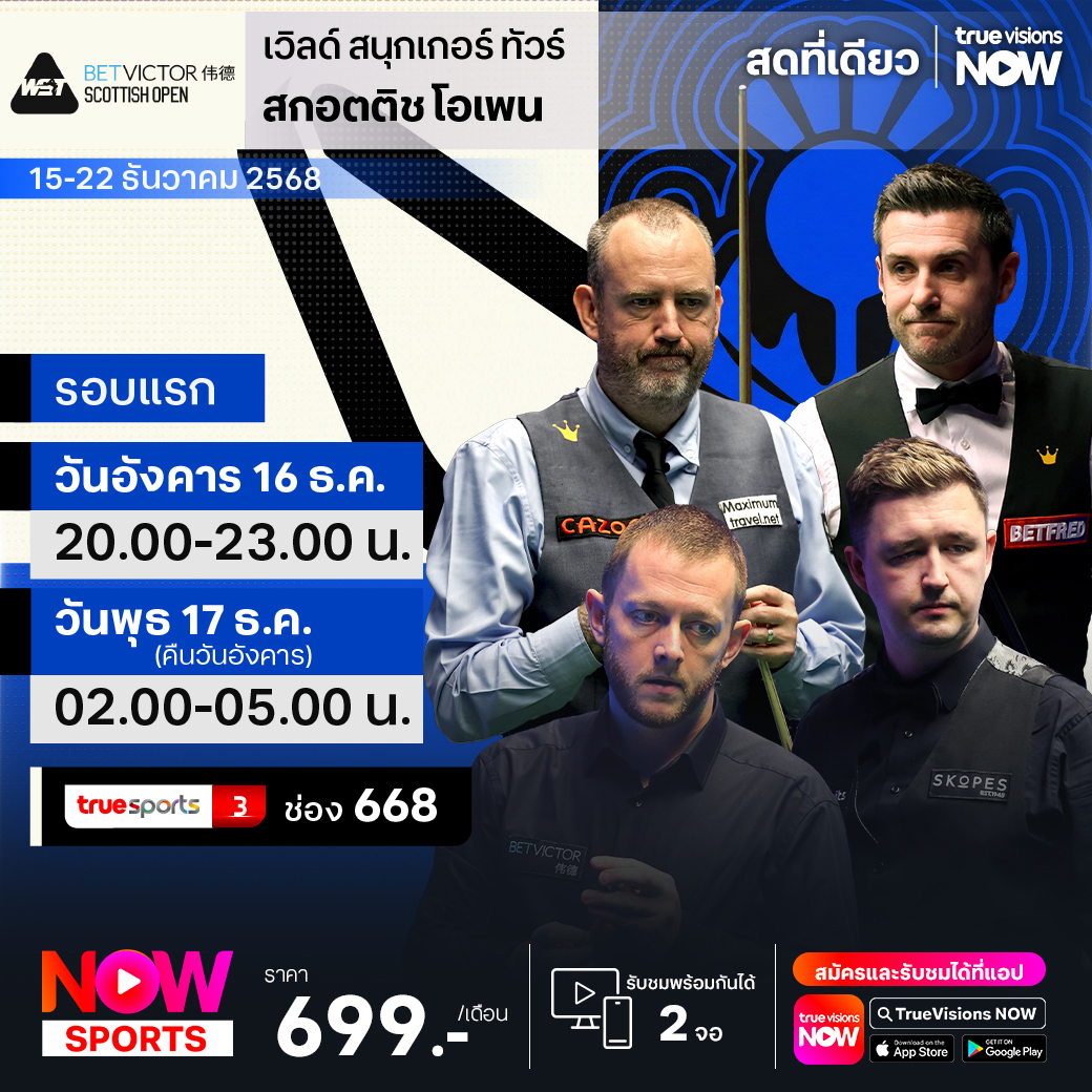 สนุกเกอร์เก็บคะแนนสะสมโลกฤดูกาล 2025/26 กำลังสนุกเข้มข้น สัปดาห์นี้ส่งท้ายปี 2025 กับรายการที่เก่าแก่และยิ่งใหญ่อย่าง สกอตติช โอเพ่น 1 ใน 4 ของ โฮม เนชั่นส์ ซีรี่ส์ ที่มี สตีเฟ่น เฮนดรี้ โทรฟี่ เป็นถ้วยชนะเลิศสำหรับแชมป์ ร่วมลุ้นกันว่าจอมแม่นคิวของโลก 128 คน ใครจะฝ่าฟันเข้าไปถึงรอบชิงชนะเลิศและเป็นแชมป์ในบั้นปลาย ชมสด ครบทุกรอบ ที่ ทรูวิชั่นส์