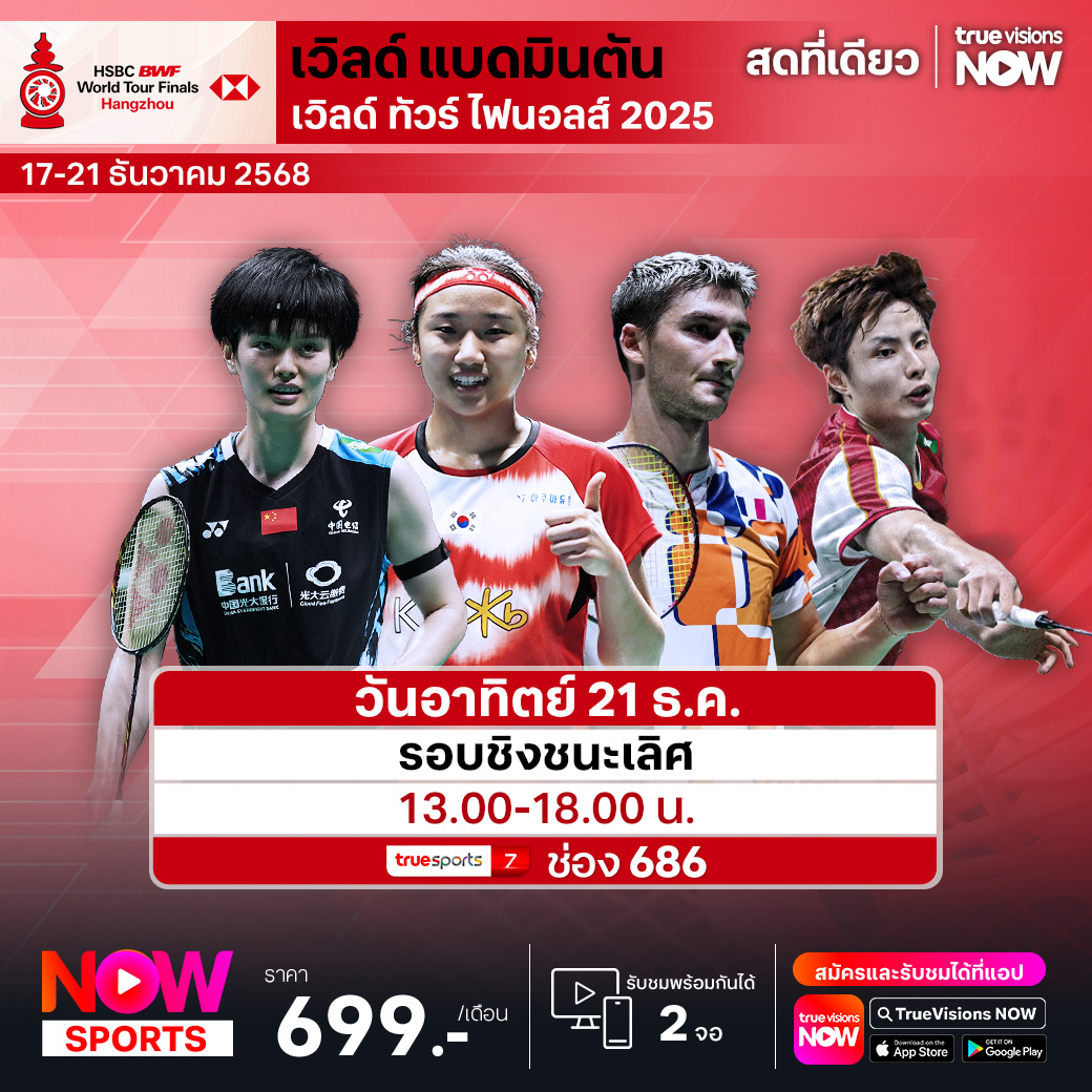 แบดมินตัน เก็บคะแนนสะสมโลก รายการท้ายสุดที่ยิ่งใหญ่ประจำปี 2025 เวิลด์ ทัวร์ ไฟนอลส์ ที่เมืองหางโจว ประเทศจีน ที่คัดมาเฉพาะสุดยอดฝีมือของโลกทั้ง 5 ประเภท มาดวลเพลงตบลูกขนไก่เพื่อตำแหน่งแชมป์แห่งศักดิ์ศรี ส่งใจเชียร์ตัวแทนจากประเทศไทย วิว กุลวุฒิ วิทิตศานต์, เมย์ รัชนก อินนทนนท์, หมิว พรปวีณ์ ช่อชูวงศ์ และคู่ผสมสุดฮ็อตของปีนี้ บาส เดชาพล พัววรานุเคราะห์ และ เฟม ศุภิสรา เพียวสามพราน ชมสด ครบทุกรอบ ที่ ทรูวิชั่นส์