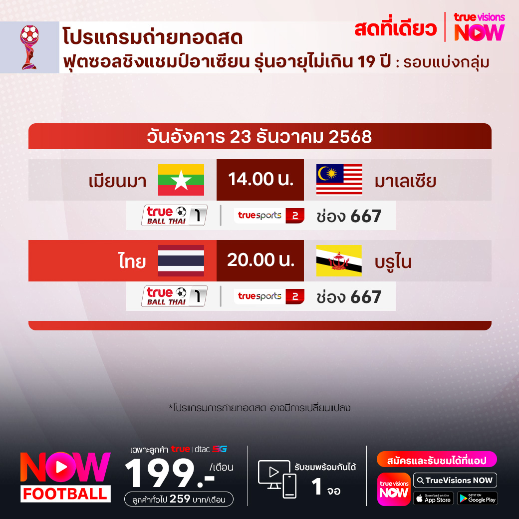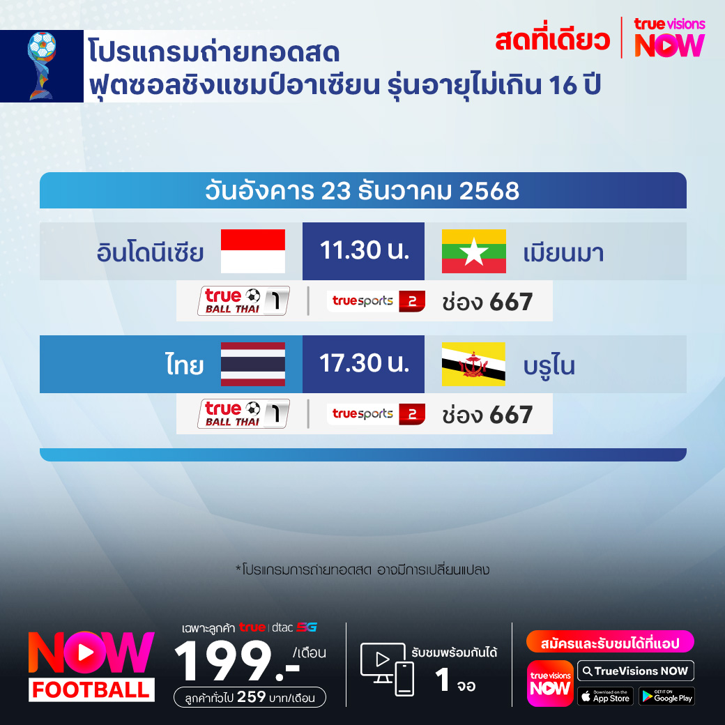 วันนี้มีอะไรดูที่ ทรูวิชั่นส์ ประจำวันอังคารที่ 23 ธันวาคม 68 ยังคงมีกีฬาที่น่าสนใจให้ได้ตามลุ้นตามเชียร์กันเหมือนเดิม โดยในส่วนของฟุตบอลยังมีศึก แอฟริกา คัพ ออฟ เนชั่นส์ ให้ได้ตามเชียร์กันต่อ ส่วนกีฬาอื่นๆ ยังมีศึกฟุตซอลชิงแชมป์อาเซียนรุ่นอายุไม่เกิน 16 และ 19 ปี และ วอลเลย์บอล วี-ลีก งานนี้ ทรูวิชั่นส์ จัดเต็มให้ชมกันถึงบ้าน