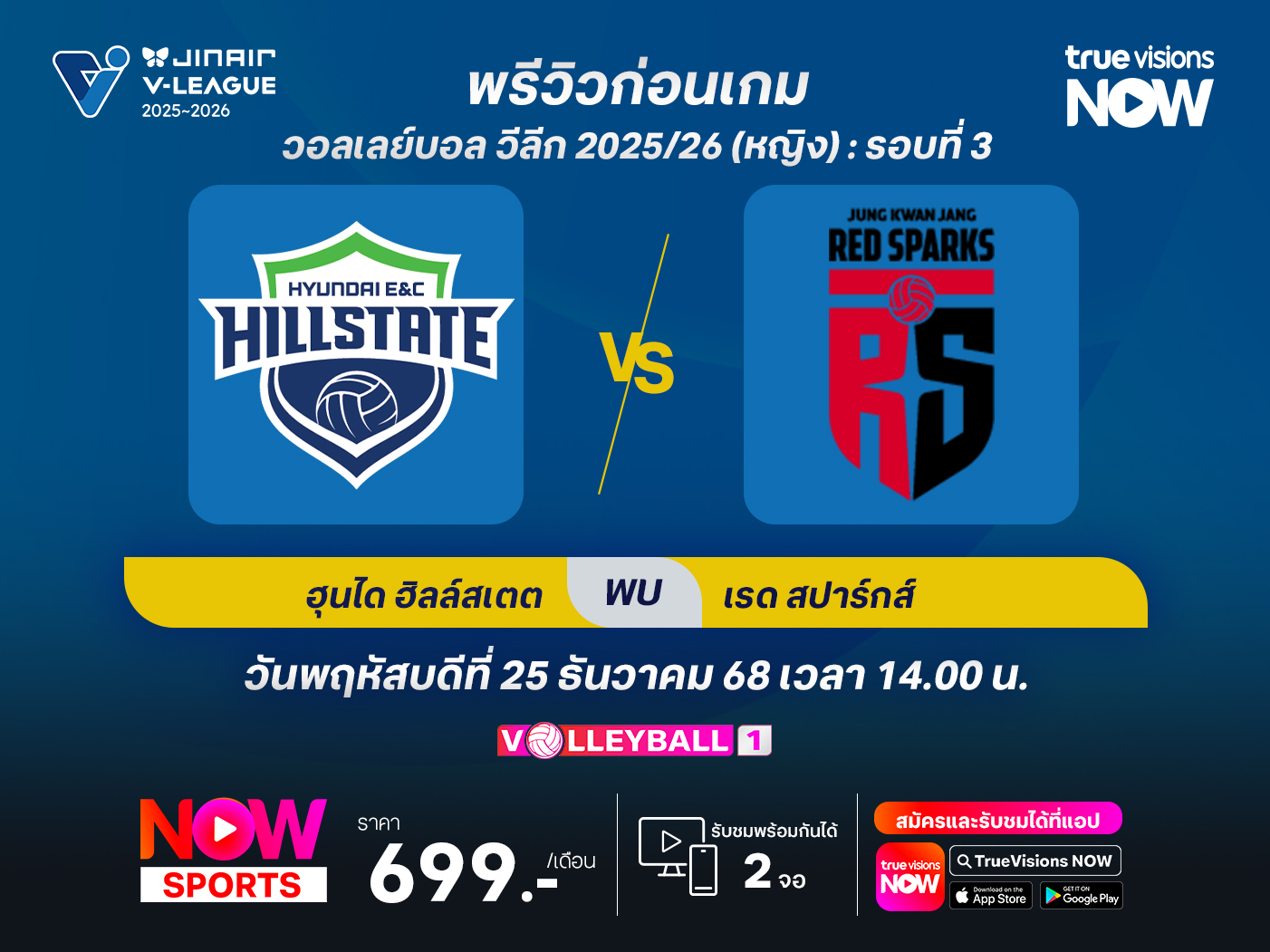 พรีวิว : วอลเลย์บอล วีลีก 2025/26 ซูวอน ฮุนได ฮิลล์สเตท พบกับ แทจอน จองกวานจัง เรดสปาร์กส์ สนาม : ซูวอน ยิมเนเซียม เวลา 14.00 น. วันพฤหัสบดีที่ 25 ธันวาคม 2568