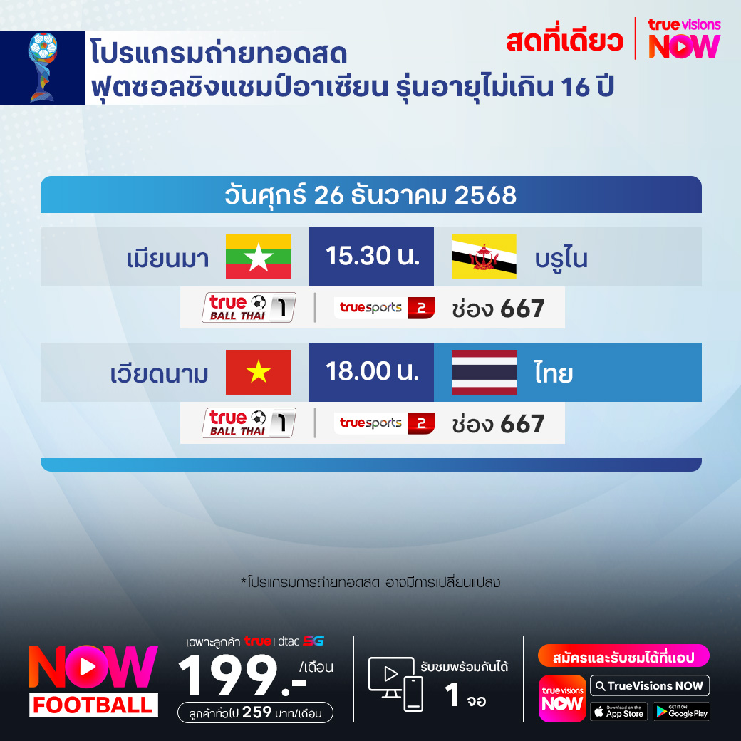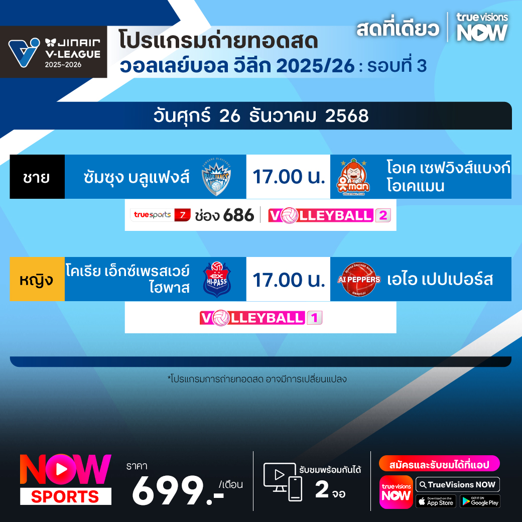 วันนี้มีอะไรดูที่ ทรูวิชั่นส์ ประจำวันศุกร์ที่ 26 ธันวาคม 68 ยังคงมีกีฬาที่น่าสนใจให้ได้ตามลุ้นตามเชียร์กันเหมือนเดิม โดยในส่วนของฟุตบอลนั้น ยังมีศึก แอฟริกา คัพ ออฟ เนชั่นส์, เอ-ลีก ออสเตรเลีย และ ซาอุดิ โปร ลีก ให้ได้ตามเชียร์กันต่อ ส่วนกีฬาอื่นๆ ยังมีฟุตซอลชิงแชมป์อาเซียนรุ่นอายุไม่เกิน 16 ปี และ วอลเลย์บอล วี-ลีก งานนี้ ทรูวิชั่นส์ จัดเต็มให้ชมกันถึงบ้าน
