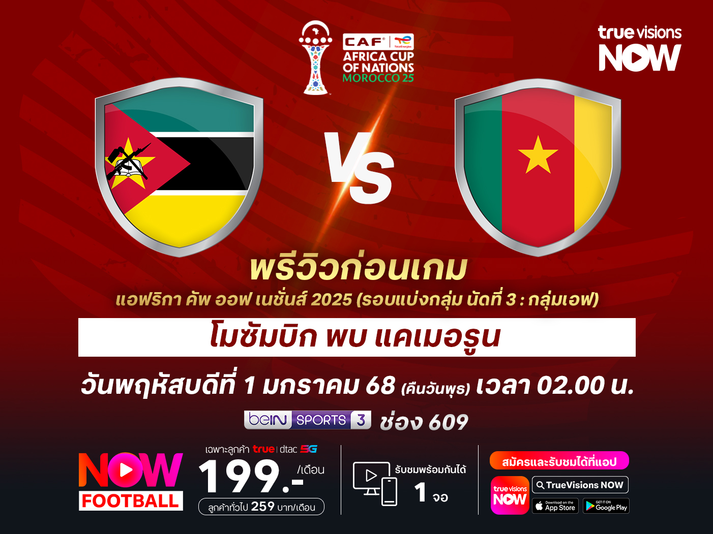 ศึก แอฟริกา คัพ ออฟ เนชั่นส์ 2025 รอบแบ่งกลุ่ม กลุ่มเอฟ นัดสุดท้าย โมซัมบิก จะเล่นที่ อาดราร์ สเตเดี้ยม พบกับ แคเมอรูน โดยเกมนี้ โมซัมบิก เข้ารอบต่อไปแน่นอนแล้วในฐานะหนึ่งในทีมอันดับ 3 ที่ดีที่สุด แม้ว่าถ้าชนะเกมนี้ได้อาจจะได้เข้ารอบเป็นอันดับที่ 1 หรือ 2 ได้เลยก็ตาม ส่วน แคเมอรูน พวกเขาน่าจะเน้นเต็มที่ เพราะถ้าชนะเกมนี้ได้น่าจะมีโอกาสสูงที่จะได้เป็นแชมป์กลุ่ม และหลีกเลี่ยงการเจอกับ แอฟริกาใต้ ในรอบ 16 ทีมได้
