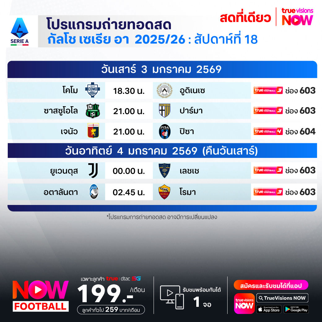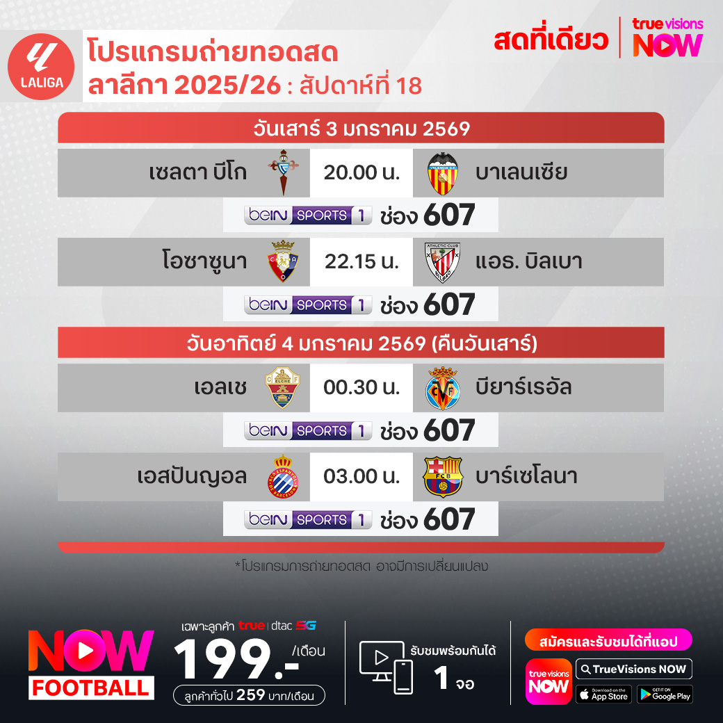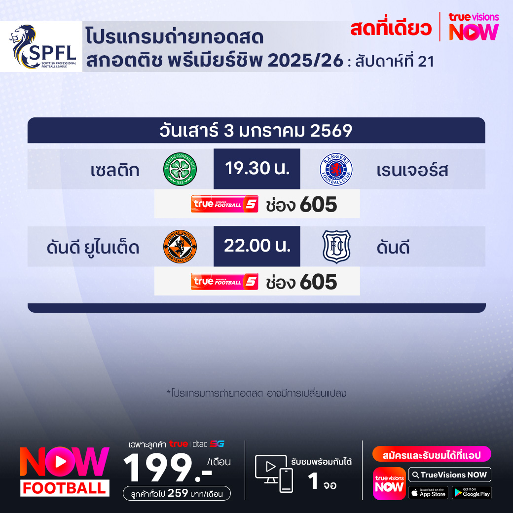 วันนี้มีอะไรดูที่ ทรูวิชั่นส์ ประจำวันเสาร์ที่ 3 มกราคม 69 ยังคงมีกีฬาที่น่าสนใจให้ได้ตามลุ้นตามเชียร์กันเหมือนเดิม โดยในส่วนของฟุตบอลนั้น ยังมีศึก แอฟริกา คัพ ออฟ เนชั่นส์ รอบ 16 ทีมสุดท้าย, ลา ลีกา สเปน, กัลโช่ เซเรีย อา อิตาลี, สกอตติช พรีเมียร์ชิพ, เอ-ลีก ออสเตรเลีย และ ซาอุดิ โปร ลีก ให้ได้ตามเชียร์กันต่อ ส่วนกีฬาอื่นๆ ยังมี วอลเลย์บอล วี-ลีก งานนี้ ทรูวิชั่นส์ จัดเต็มให้ชมกันถึงบ้าน