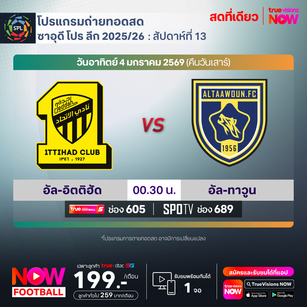 Al Ittihad vs Al Taawoun เวลา 00.30-02.30 ทางช่องTPF 5(605)/ SPOTV (689)
