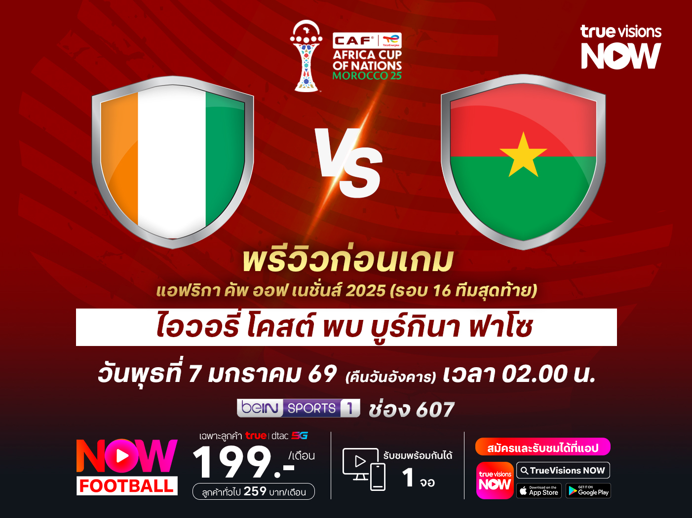ศึก แอฟริกา คัพ ออฟ เนชั่นส์ 2025 รอบ 16 ทีมสุดท้าย ไอวอรี่ โคสต์ จะเล่นที่ มาร์ราเคช สเตเดี้ยม พบกับ บูร์กินาฟาโซ โดยเกมนี้ ไอวอรี่ โคสต์ มีสภาพทีมที่ค่อนข้างพร้อม และมีฟอร์มการเล่นที่ดีมาตั้งแต่ในรอบแบ่งกลุ่ม โดยพวกเขายังไม่แพ้ใครจาก 3 เกมที่ผ่านมา ขณะที่ บูร์กินาฟาโซ ถือว่าทำได้ดีเกินคาดในรอบแรก แต่การต้องเจอกับ ไอวอรี่ โคสต์ ในรอบนี้อาจจะทำให้พวกเขายุติเส้นทางใน แอฟริกา คัพ ออฟ เนชั่นส์ ไว้แต่เพียงเท่านี้