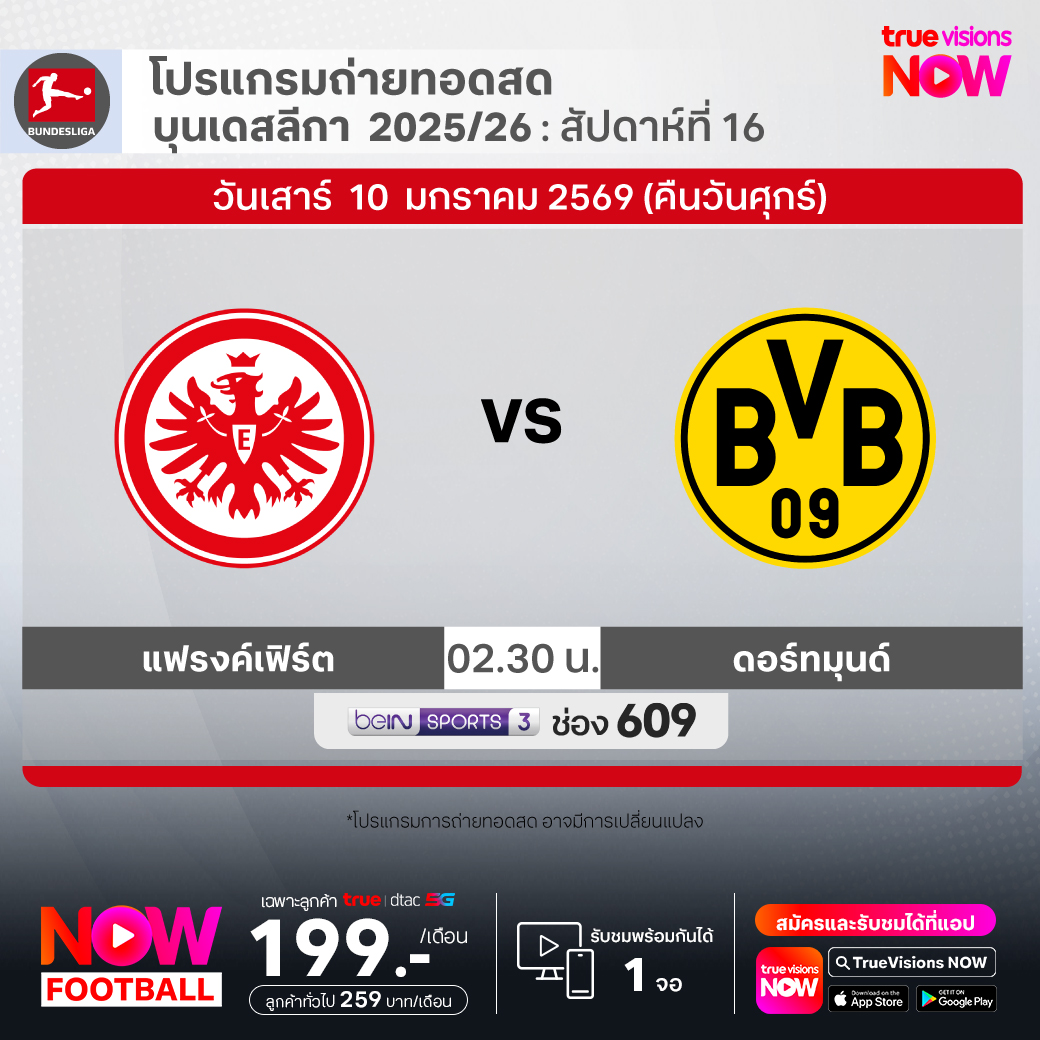 Frankfurt vs Dortmund เวลา 02.30-04.30 ทางช่อง beIN 3 (609)