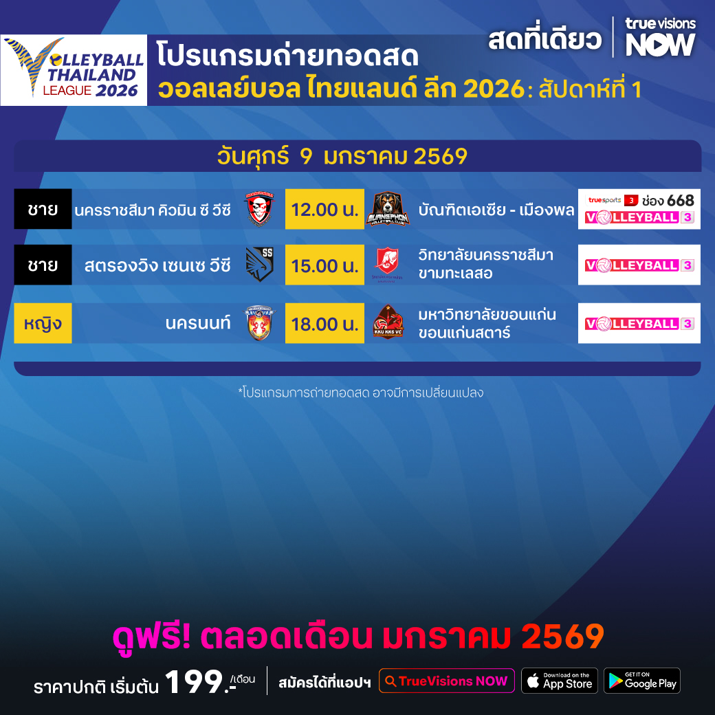 วันนี้มีอะไรดูที่ ทรูวิชั่นส์ ประจำวันศุกร์ที่ 9 มกราคม 69 ยังคงมีกีฬาที่น่าสนใจให้ได้ตามลุ้นตามเชียร์กันเหมือนเดิม โดยในส่วนของฟุตบอลนั้น ยังมีศึก แอฟริกา คัพ ออฟ เนชั่นส์ รอบก่อนรองชนะเลิศฯ, ลา ลีกา สเปน, บุนเดสลีกา เยอรมนี, เอ-ลีก ออสเตรเลีย และ ซาอุดิ โปร ลีก ให้ได้ตามเชียร์กันต่อ ส่วนกีฬาอื่นๆ ยังมี ลิฟ กอล์ฟ โปรโมชั่นส์, เทนนิสหญิง ดับเบิ้ลยูทีเอ ทัวร์ รายการ บริสเบน อินเตอร์เนชั่นแนล, แบดมินตัน บีดับเบิ้ลยูเอฟ รายการ มาเลเซีย โอเพ่น, วอลเลย์บอล วี-ลีก และ วอลเลย์บอล ไทยแลนด์ ลีก งานนี้ ทรูวิชั่นส์ จัดเต็มให้ชมกันถึงบ้าน