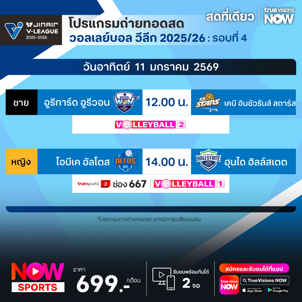 ไอบีเค อัลโตส พบ ฮุนได ฮิลล์สเตต เวลา 14.00 ทางช่อง TS 2 (667) / Volleyball 1