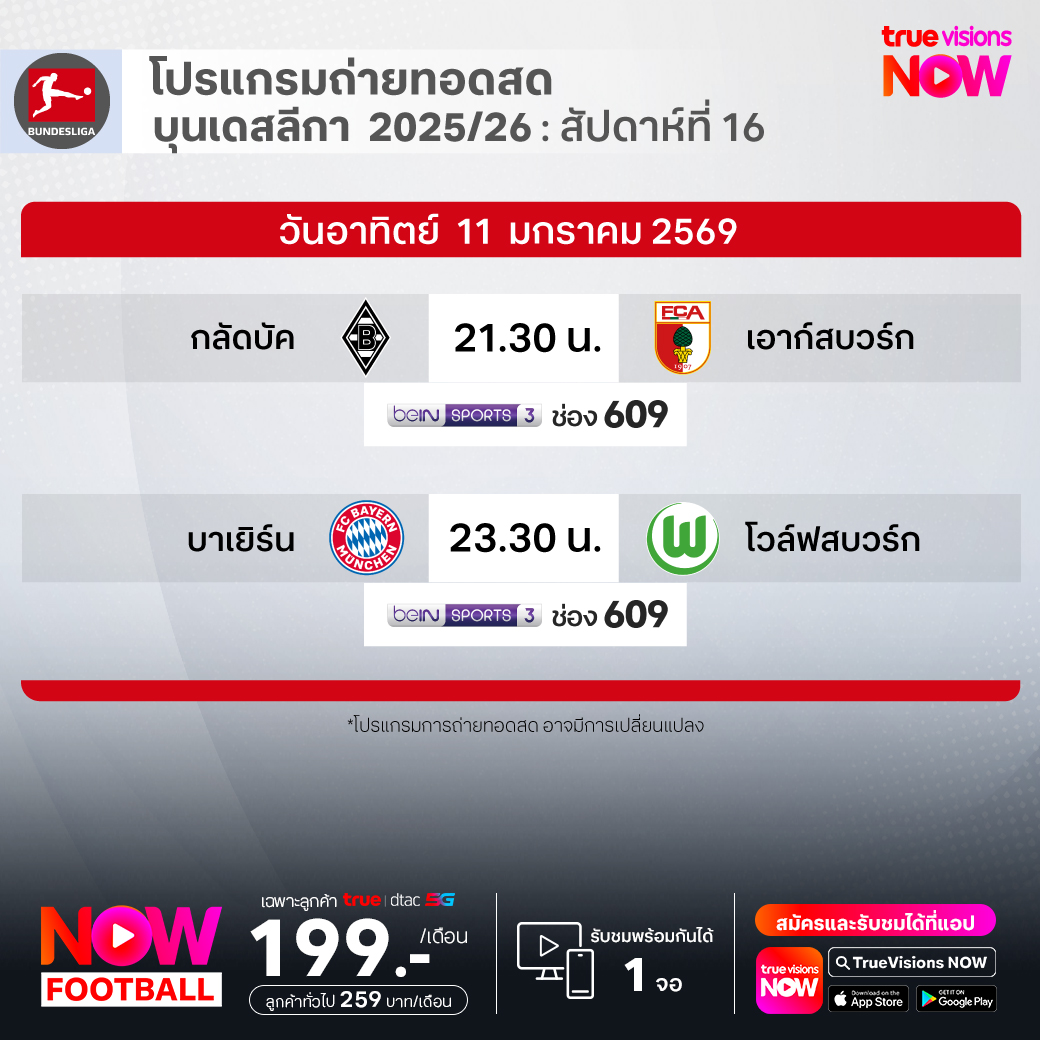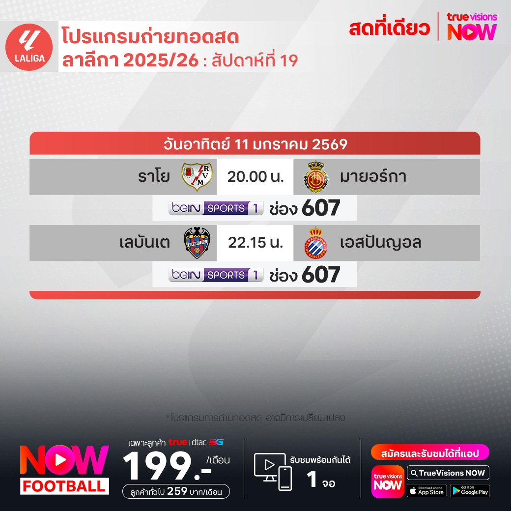 วันนี้มีอะไรดูที่ ทรูวิชั่นส์ ประจำวันอาทิตย์ที่ 11 มกราคม 69 ยังคงมีกีฬาที่น่าสนใจให้ได้ตามลุ้นตามเชียร์กันเหมือนเดิม โดยในส่วนของฟุตบอลนั้น ยังมีศึก ลา ลีกา สเปน, บุนเดสลีกา เยอรมนี, กัลโช่ เซเรีย อา อิตาลี, สกอตติช พรีเมียร์ชิพ และ เอ-ลีก ออสเตรเลีย ให้ได้ตามเชียร์กันต่อ ส่วนกีฬาอื่นๆ ยังมี ลิฟ กอล์ฟ โปรโมชั่นส์, เทนนิสหญิง ดับเบิ้ลยูทีเอ ทัวร์ รายการ บริสเบน อินเตอร์เนชั่นแนล, แบดมินตัน บีดับเบิ้ลยูเอฟ รายการ มาเลเซีย โอเพ่น, เวิลด์ สนุกเกอร์ ทัวร์ รายการ จอห์นสโตนส์ เพนท์ มาสเตอร์ส และ วอลเลย์บอล วี-ลีก งานนี้ ทรูวิชั่นส์ จัดเต็มให้ชมกันถึงบ้าน