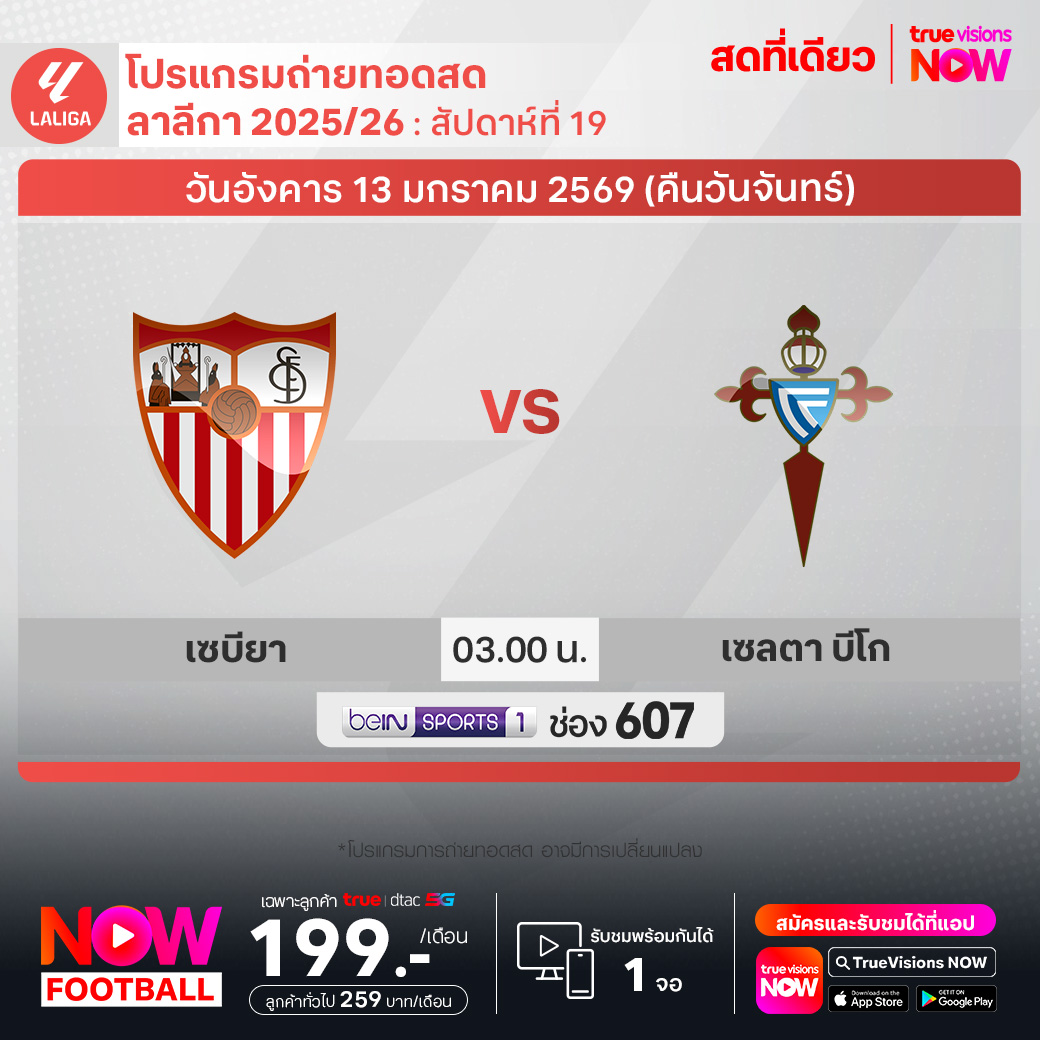 Sevilla vs Celta Vigo เวลา 03.00-05.00 ทางช่อง beIN 1 (607)