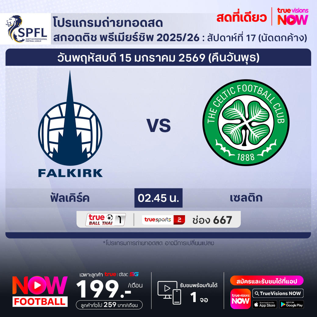 Falkirk vs Celtic เวลา 02.45-04.45 ทางช่อง True Ball Thai 1 / TS 2 (667)