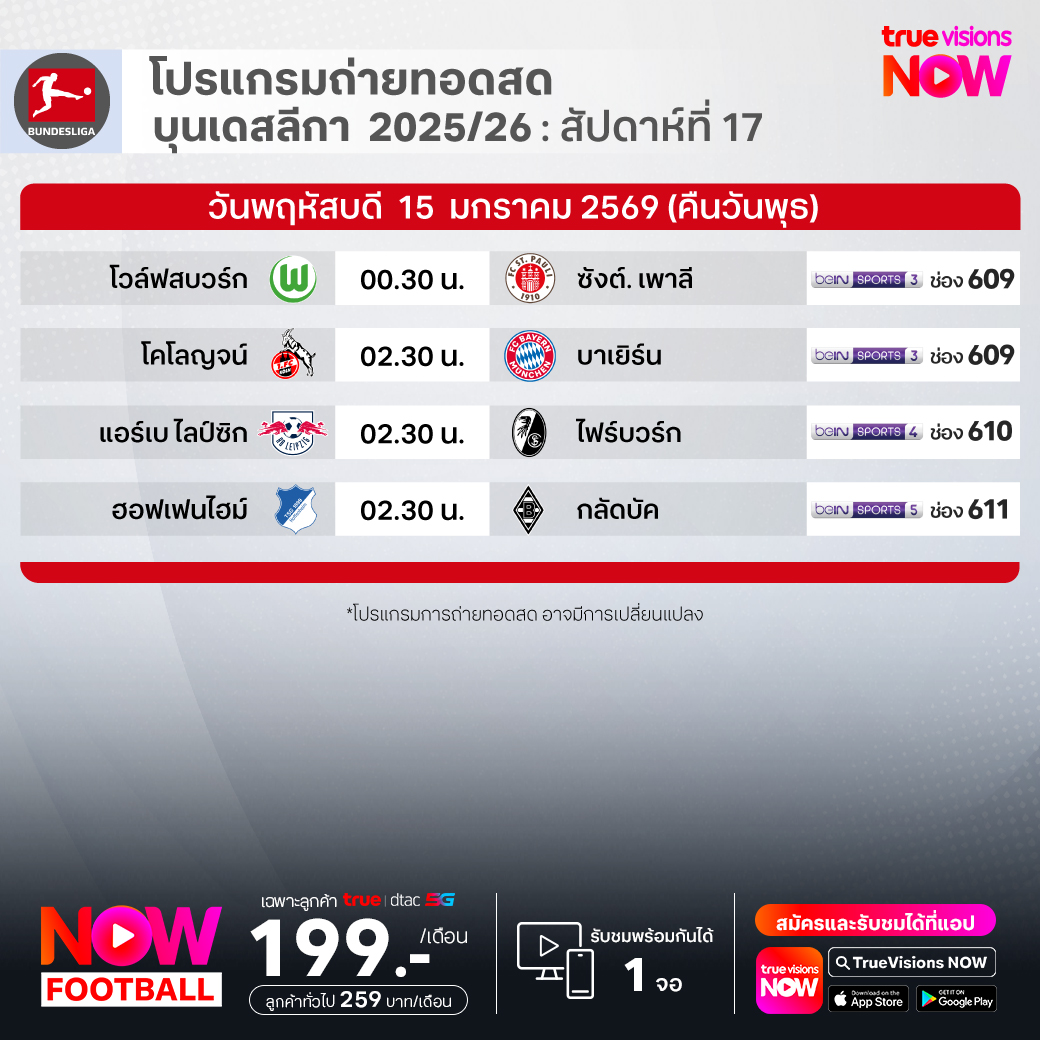 Wolfsburg vs St. Pauli เวลา 00.30-02.30 ทางช่อง beIN 3 (609)