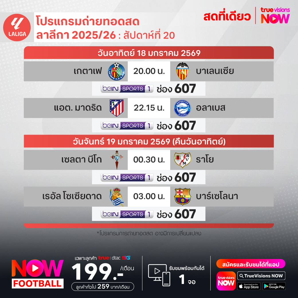 วันนี้มีอะไรดูที่ ทรูวิชั่นส์ ประจำวันอาทิตย์ที่ 18 มกราคม 69 ยังคงมีกีฬาที่น่าสนใจให้ได้ตามลุ้นตามเชียร์กันเหมือนเดิม โดยในส่วนของฟุตบอลนั้น ยังมีศึก แอฟริกา คัพ ออฟ เนชั่นส์ รอบชิงชนะเลิศ, ลา ลีกา สเปน, บุนเดสลีกา เยอรมนี, กัลโช่ เซเรีย อา อิตาลี, เอ-ลีก ออสเตรเลีย และ ซาอุดิ โปร ลีก ให้ได้ตามเชียร์กันต่อ ส่วนกีฬาอื่นๆ พลาดไม่ได้กับศึกเทนนิสออสเตรเลียน โอเพ่น แกรนด์สแลมแรกของปี, เวิลด์ สนุกเกอร์ ทัวร์ รายการ จอห์นสโตนส์ เพนท์ มาสเตอร์ส, แบดมินตัน บีดับเบิ้ลยูเอฟ รายการ อินเดีย โอเพ่น และ วอลเลย์บอล วี-ลีก งานนี้ ทรูวิชั่นส์ จัดเต็มให้ชมกันถึงบ้าน