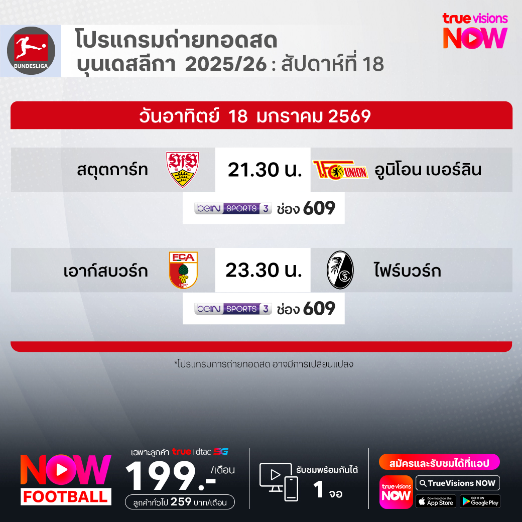 Augsburg vs Freiburg เวลา 23.30-01.30 ทางช่อง beIN 3 (609)