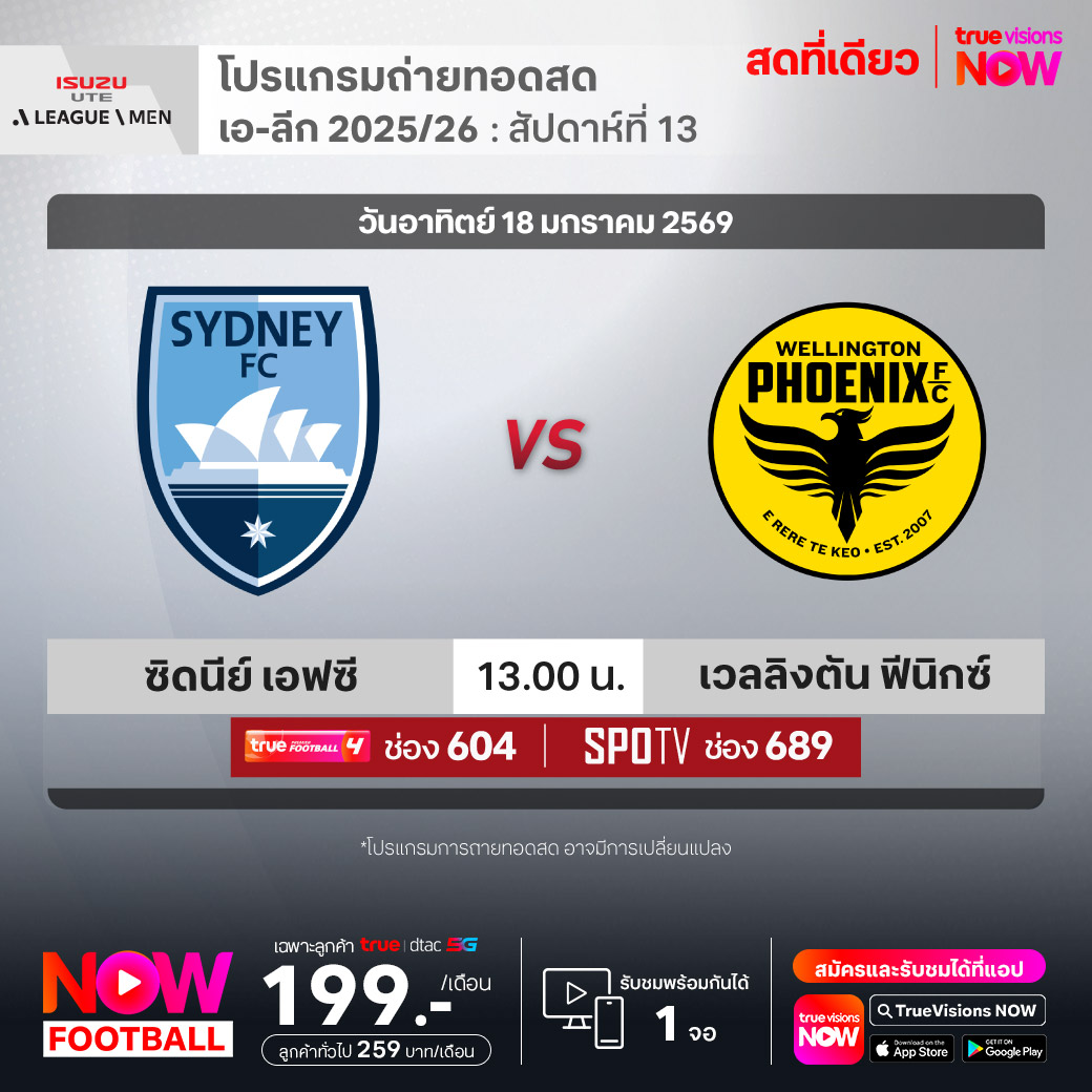 Sydney FC vs Wellington Phoenix เวลา 13.00-15.00 ทางช่องTPF 4(604) / SPOTV (689)