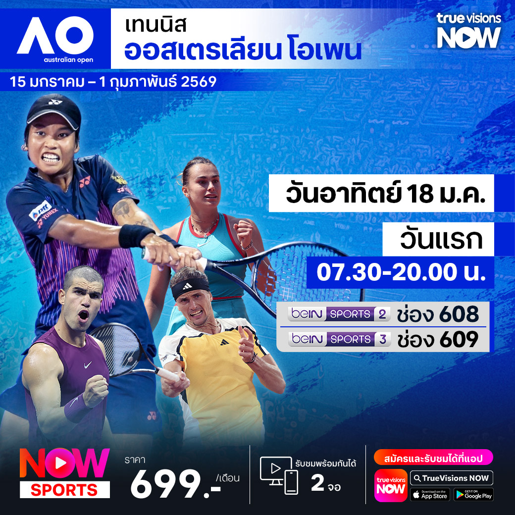 ศึกเทนนิส ออสเตรเลียน โอเพ่น แกรนด์สแลมแรกของปี 2026 เริ่มต้นอีกครั้ง กับการแข่งขันในสภาพอากาศที่ร้อนจัดของเมืองเมลเบิร์น ประเทศออสเตรเลีย แชมป์เก่า ยานนิค ซินเนอร์ ลงป้องกันแชมป์อีกครั้ง ร่วมด้วย คาร์ลอส อัลคาราซ และ โนวัค ยอโชวิช ส่วนในประเภทหญิงเดี่ยว ม้ามืดในปีก่อน เมดิสัน คีย์ ลงป้องกันแชมป์ พร้อมชนกับนักเทนนิสหญิงชื่อดังทั้ง อารีนา ซาบาเลนกา และ อิกา ซิออนเทค ร่วมลุ้นว่าใครจะคว้าแชมป์ไปครองทั้งประเภทชายและประเภทหญิง ชมสด ครบทุกรอบ ที่ ทรูวิชั่นส์