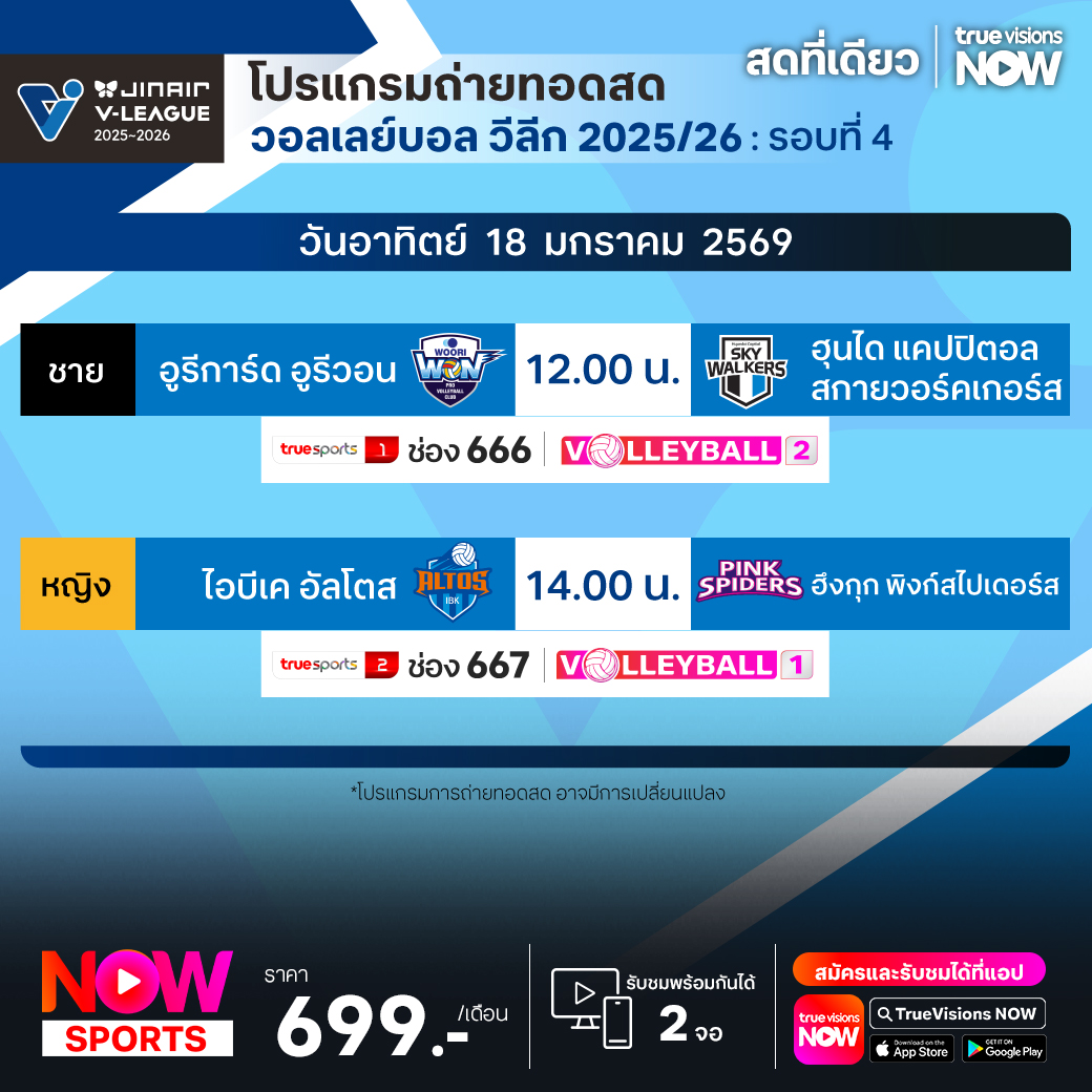 อูรีการ์ด อูรีวอน พบ ฮุนได แคปปิตอล สกายวอร์คเกอร์ส เวลา 12.00 ทางช่อง TS 1 (666) / Volleyball 2