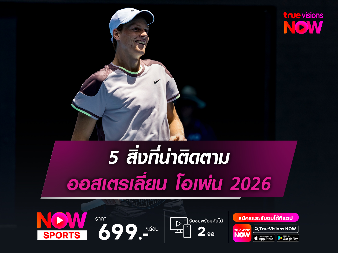 แกรนด์แสลม ออสเตรเลี่ยน โอเพ่น วันที่ 18 ม.ค. - 1 ก.พ. นี้ ถ่ายทอดสดผ่านแอพพลิเคชั่น ทรูวิชั่นส์ นาว ช่อง บีอินสปอร์ตส์ 2 (608) และ บีอินสปอร์ตส์ 3 (609)
