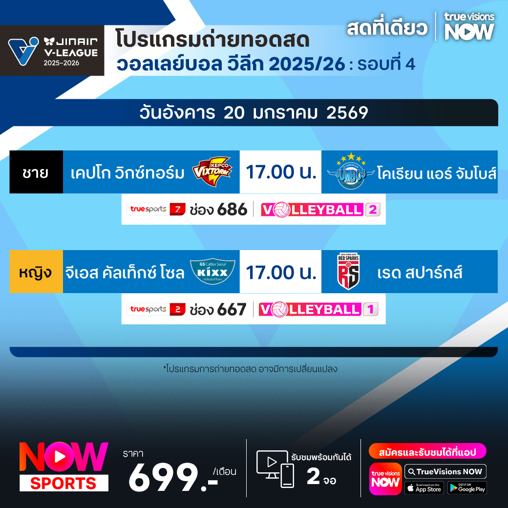 เคปโก วิกซ์ทอร์ม พบ โคเรียน แอร์ จัมโบส์ เวลา 17.00 ทางช่อง TS 7 (686) / Volleyball 2