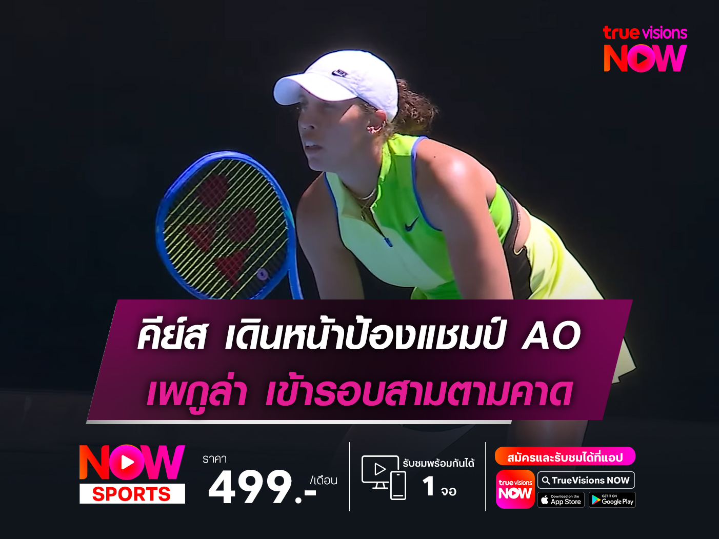แกรนด์แสลม ออสเตรเลี่ยน โอเพ่น วันที่ 18 ม.ค. - 1 ก.พ. นี้ ถ่ายทอดสดผ่านแอพพลิเคชั่น ทรูวิชั่นส์ นาว ช่อง บีอินสปอร์ตส์ 2 (608) และ บีอินสปอร์ตส์ 3 (609)