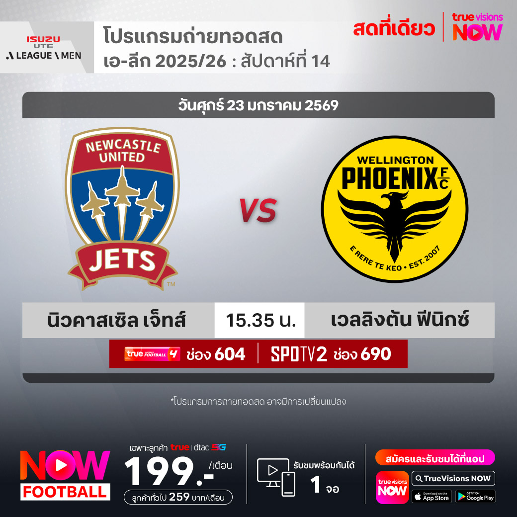 Newcastle Jets FC vs Wellington Phoenix เวลา 15.35-17.35 ทางช่องTPF 4(604)/SPOTV2 (690)