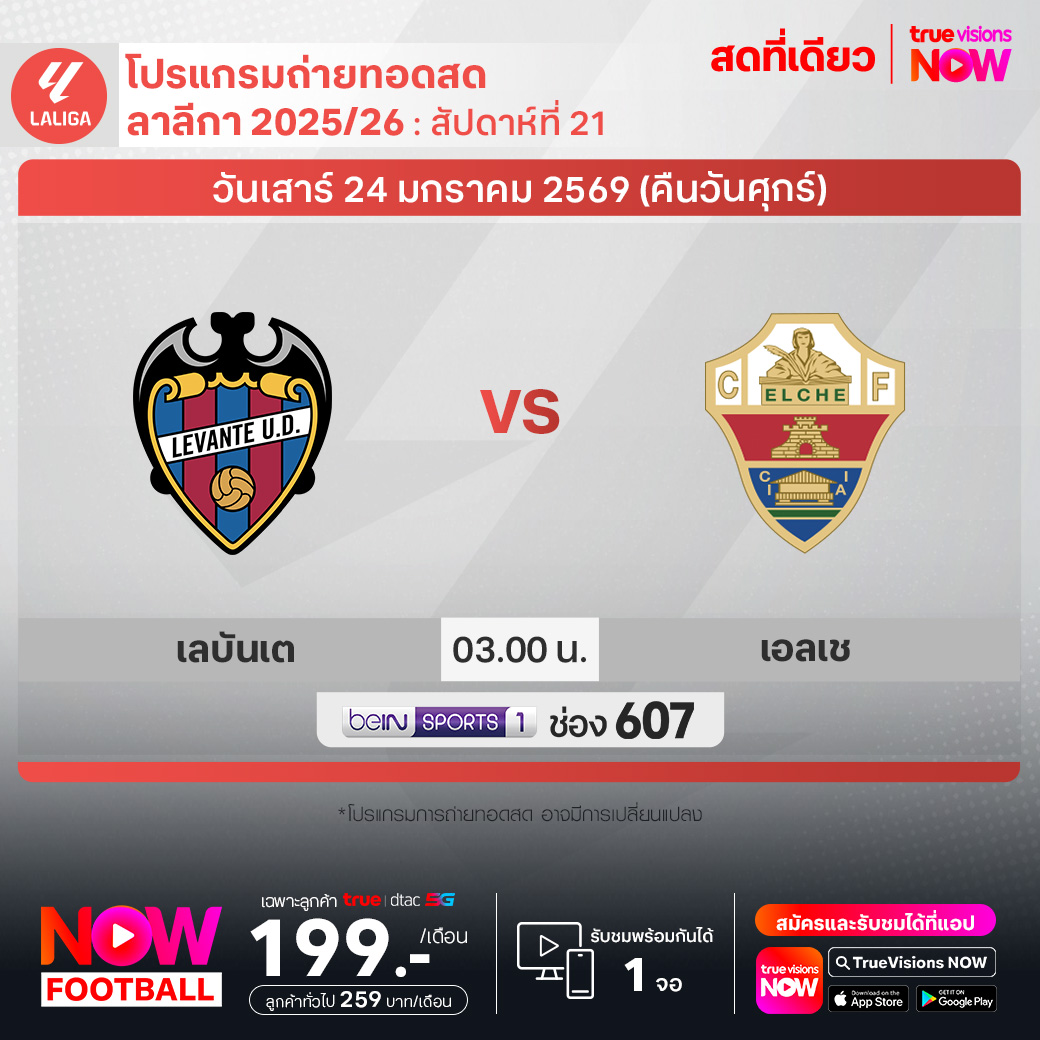 Levante vs Elche เวลา 03.00-05.00 ทางช่อง beIN 1 (607)