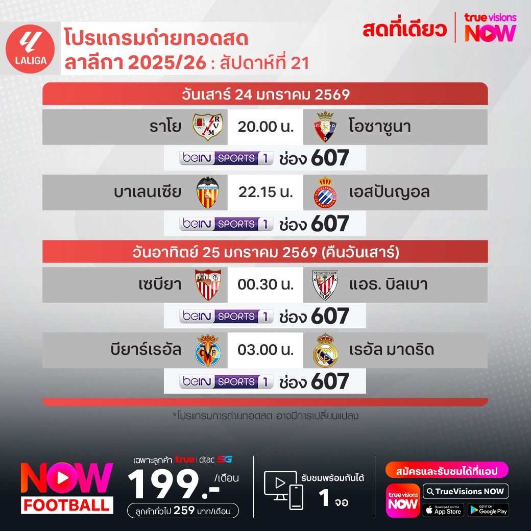 วันนี้มีอะไรดูที่ ทรูวิชั่นส์ ประจำวันเสาร์ที่ 24 มกราคม 69 ยังคงมีกีฬาที่น่าสนใจให้ได้ตามลุ้นตามเชียร์กันเหมือนเดิม โดยในส่วนของฟุตบอลนั้น ยังมีศึก ลา ลีกา สเปน, บุนเดสลีกา เยอรมนี, กัลโช่ เซเรีย อา อิตาลี และ เอ-ลีก ออสเตรเลีย ให้ได้ตามเชียร์กันต่อ ส่วนกีฬาอื่นๆ พลาดไม่ได้กับการแข่งขันกีฬาอาเซียนพาราเกมส์ 2025, ศึกเทนนิสออสเตรเลียน โอเพ่น แกรนด์สแลมแรกของปี, แบดมินตัน บีดับเบิ้ลยูเอฟ รายการ อินโดนีเซีย มาสเตอร์ส และ วอลเลย์บอล ไทยแลนด์ ลีก งานนี้ ทรูวิชั่นส์ จัดเต็มให้ชมกันถึงบ้าน