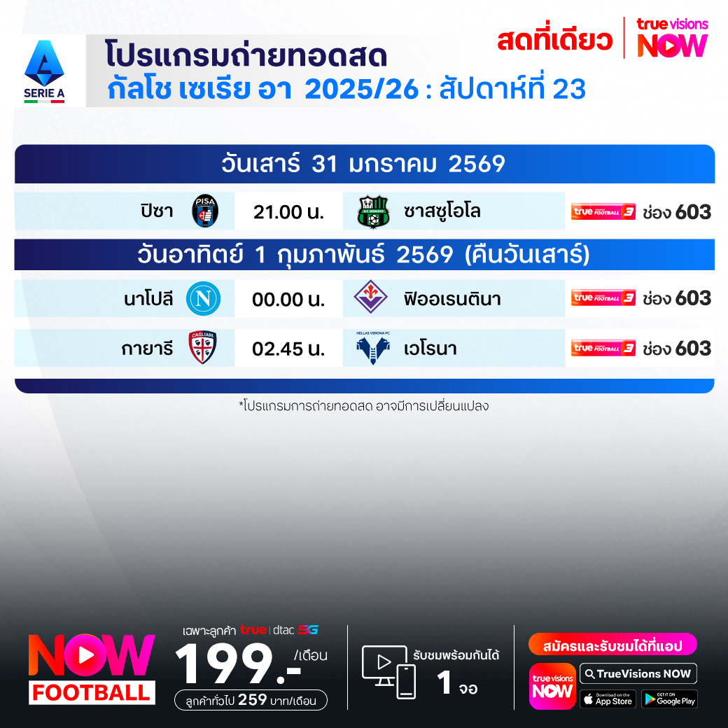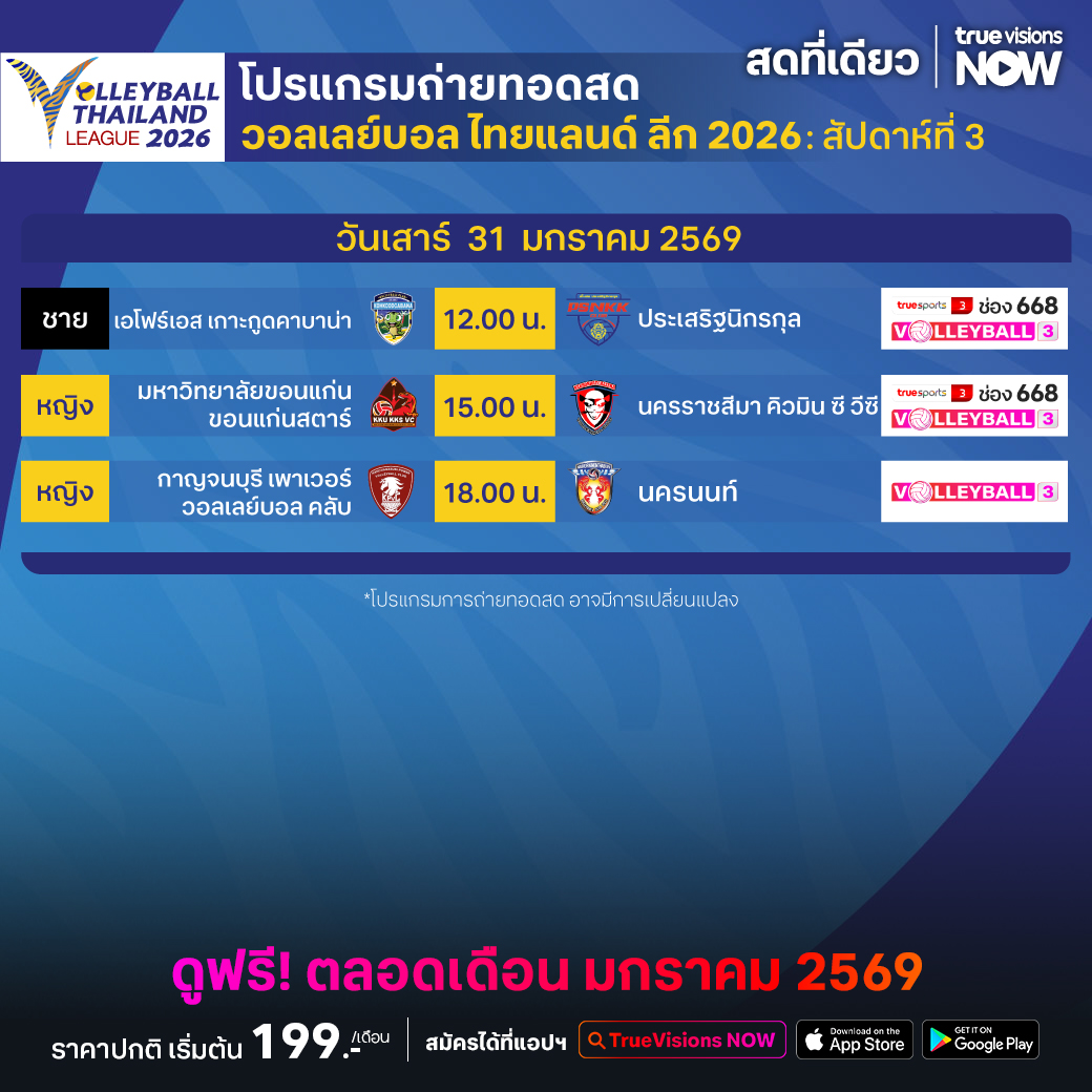 วันนี้มีอะไรดูที่ ทรูวิชั่นส์ ประจำวันเสาร์ที่ 31 มกราคม 69 ยังคงมีกีฬาที่น่าสนใจให้ได้ตามลุ้นตามเชียร์กันเหมือนเดิม โดยในส่วนของฟุตบอลนั้น ยังมีศึก ลา ลีกา สเปน, บุนเดสลีกา เยอรมนี, กัลโช่ เซเรีย อา อิตาลี, สกอตติช พรีเมียร์ชิพ, ลีกา 2 เยอรมนี และ เอ-ลีก ออสเตรเลีย ให้ได้ตามเชียร์กันต่อ ส่วนกีฬาอื่นๆ พลาดไม่ได้กับศึกเทนนิสออสเตรเลียน โอเพ่น แกรนด์สแลมแรกของปี, เวิลด์ สนุกเกอร์ ทัวร์ รายการ เยอรมัน มาสเตอร์ส, แบดมินตันบีดับเบิ้ลยูเอฟ รายการ ไทยแลนด์ มาสเตอร์ส, วอลเลย์บอล วี-ลีก และ วอลเลย์บอล ไทยแลนด์ ลีก งานนี้ ทรูวิชั่นส์ จัดเต็มให้ชมกันถึงบ้าน