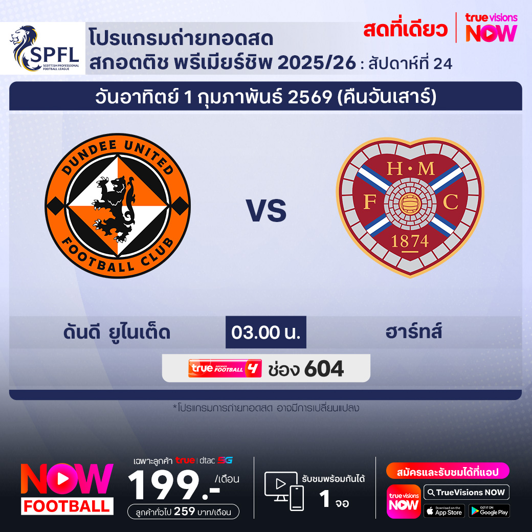 Dundee United vs Heart of Midlothian เวลา 03.00-05.00 ทางช่องTPF 4(604)