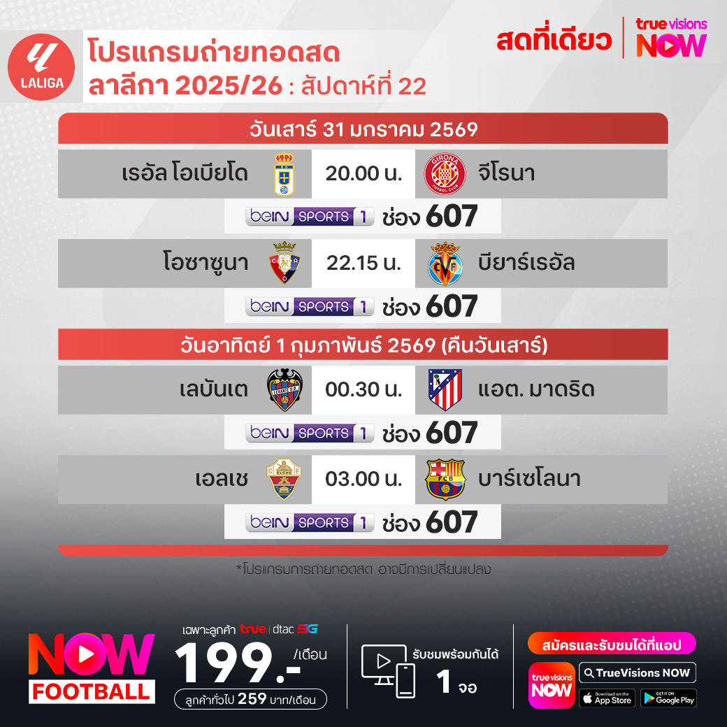 Levante vs Atletico Madrid เวลา 00.30-02.30 ทางช่อง beIN 1 (607)