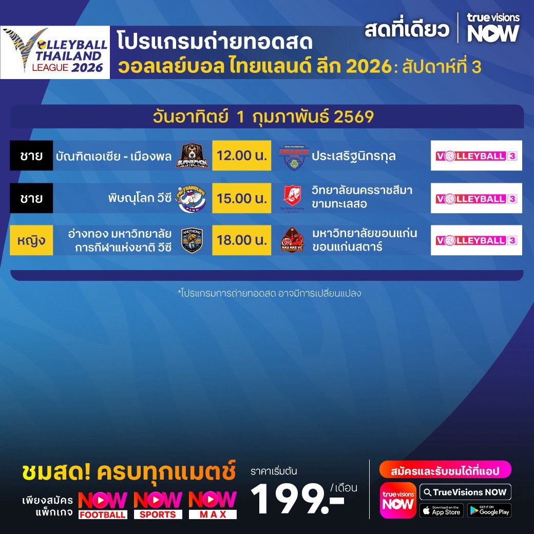 อ่างทอง มหาวิทยาลัย การกีฬาแห่งชาติ วีซี พบ มหาวิทยาลัยขอนแก่น ขอนแก่นสตาร์ เวลา 18.00 ทางช่อง Volleyball 3