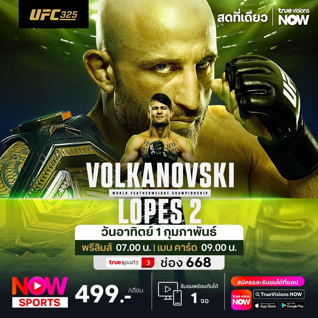 มาถึงแล้วกับไฟต์ใหญ่ ประเดิมเดือนกุมภาพันธ์กับความมันส์ระดับโลก ยูเอฟซี 325 คู่เอกเป็นศึกรีแมตช์ไฟต์ล้างตากันระหว่าง อเล็กซานเดอร์ โวลคานอฟสกี้ เจ้าของแชมป์เฟเธอร์เวตชาวออสเตรเลียน ลงทำศึกในบ้านต่อหน้าแฟนๆ กับคู่ปรับจอมห้าวจากบราซิล ดีเอโก้ โลเปส ร่วมด้วย แดน ฮุ้กเกอร์ ปะทะ เบนัว แซงต์ เดนีส์ ชมสด จุใจ ตั้งแต่ช่วงพรีลิมส์ ยาวจนไปจบช่วงเมน คาร์ด เอ็กซ์คลูซีฟ จาก คิวดอส แบงค์ อารีน่า เมืองซิดนีย์ ประเทศออสเตรเลีย