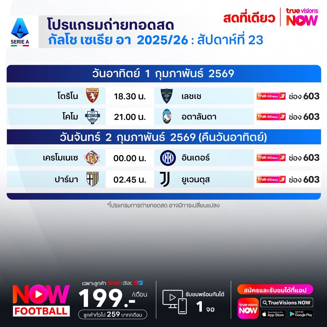 วันนี้มีอะไรดูที่ ทรูวิชั่นส์ ประจำวันอาทิตย์ที่ 1 กุมภาพันธ์ 69 ยังคงมีกีฬาที่น่าสนใจให้ได้ตามลุ้นตามเชียร์กันเหมือนเดิม โดยในส่วนของฟุตบอลนั้น ยังมีศึก ลา ลีกา สเปน, บุนเดสลีกา เยอรมนี, กัลโช่ เซเรีย อา อิตาลี, สกอตติช พรีเมียร์ชิพ, เอ-ลีก ออสเตรเลีย และ ซาอุดิ โปร ลีก ให้ได้ตามเชียร์กันต่อ ส่วนกีฬาอื่นๆ พลาดไม่ได้กับศึกเทนนิสออสเตรเลียน โอเพ่น แกรนด์สแลมแรกของปี, เวิลด์ สนุกเกอร์ ทัวร์ รายการ เยอรมัน มาสเตอร์ส, แบดมินตันบีดับเบิ้ลยูเอฟ รายการ ไทยแลนด์ มาสเตอร์ส, ยูเอฟซี 325, เวิลด์ บ็อกซิ่ง, วอลเลย์บอล วี-ลีก และ วอลเลย์บอล ไทยแลนด์ ลีก งานนี้ ทรูวิชั่นส์ จัดเต็มให้ชมกันถึงบ้าน
