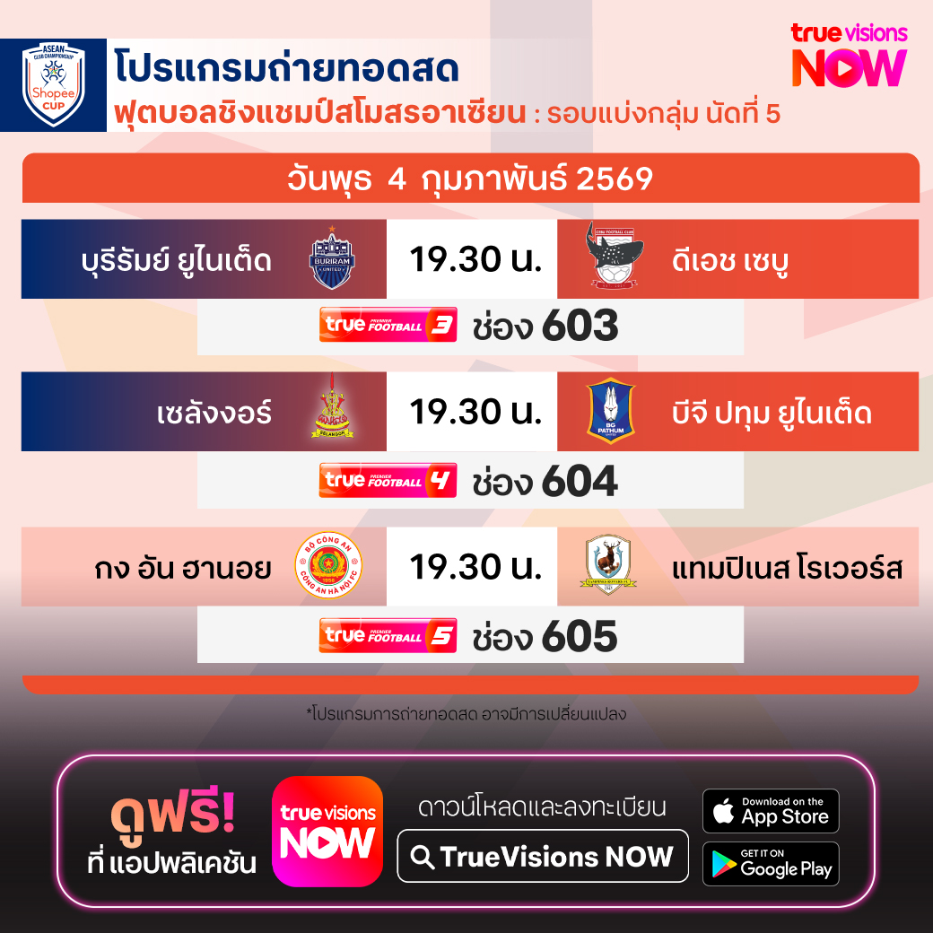 วันนี้มีอะไรดูที่ ทรูวิชั่นส์ ประจำวันพุธที่ 4 กุมภาพันธ์ 69 ยังคงมีกีฬาที่น่าสนใจให้ได้ตามลุ้นตามเชียร์กันเหมือนเดิม โดยในส่วนของฟุตบอลนั้น ยังมีศึก โคปปา อิตาเลีย, เดเอฟเบ โพคาล, สกอตติช พรีเมียร์ชิพ และ ฟุตบอลชิงแชมป์สโมสรอาเซียน ให้ได้ตามเชียร์กันต่อ ส่วนกีฬาอื่นๆ พลาดไม่ได้กับการแข่งขันโอลิมปิกฤดูหนาว 2026, เทนนิสหญิง ดับเบิ้ลยูทีเอ ทัวร์ รายการ อาบูดาบี โอเพ่น, ลิฟ กอล์ฟ ริยาดห์, เวิลด์ สนุกเกอร์ ทัวร์ รายการ เวิลด์ กรังด์ปรีซ์, แบดมินตัน เอเชีย ทีม แชมเปี้ยนชิพ, วอลเลย์บอล ซีอีวี แชมเปี้ยนส์ ลีก, วอลเลย์บอล วี-ลีก และ วอลเลย์บอล ไทยแลนด์ลีก งานนี้ ทรูวิชั่นส์ จัดเต็มให้ชมกันถึงบ้าน