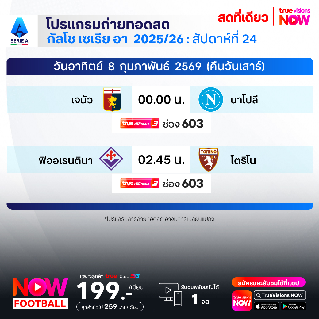 Genoa vs Napoli เวลา 00.00-02.00 ทางช่องTPF 3(603)