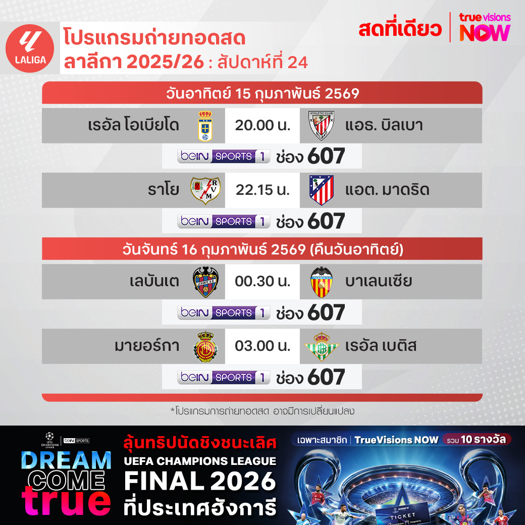 วันนี้มีอะไรดูที่ ทรูวิชั่นส์ ประจำวันอาทิตย์ที่ 15 กุมภาพันธ์ 69 ยังคงมีกีฬาที่น่าสนใจให้ได้ตามลุ้นตามเชียร์กันเหมือนเดิม โดยในส่วนของฟุตบอลยังมีศึก ลา ลีกา สเปน, บุนเดสลีกา เยอรมนี, กัลโช่ เซเรีย อา อิตาลี และ สกอตติช พรีเมียร์ชิพ ให้ได้ตามเชียร์กันต่อ ส่วนกีฬาอื่นๆ ยังมีการแข่งขันโอลิมปิกฤดูหนาว 2026, เทนนิสหญิง ดับเบิ้ลยูทีเอ ทัวร์ รายการ ดูไบ แชมเปี้ยนชิพส์, ลิฟ กอล์ฟ แอดิเลด, แบดมินตัน ทีมชายและทีมหญิง ชิงแชมป์ยุโรป, แบดมินตัน แบด เว็บ ไทยแลนด์ จูเนียร์ ทัวร์นาเมนท์, รักบี้ ซิกซ์ เนชั่นส์, มวยไทย ดิ อัลติเมท มวยไทย เอ็กซ์พีเรียนซ์, วอลเลย์บอล วี-ลีก และ วอลเลย์บอล ไทยแลนด์ ลีก งานนี้ ทรูวิชั่นส์ จัดเต็มให้ชมกันถึงบ้าน