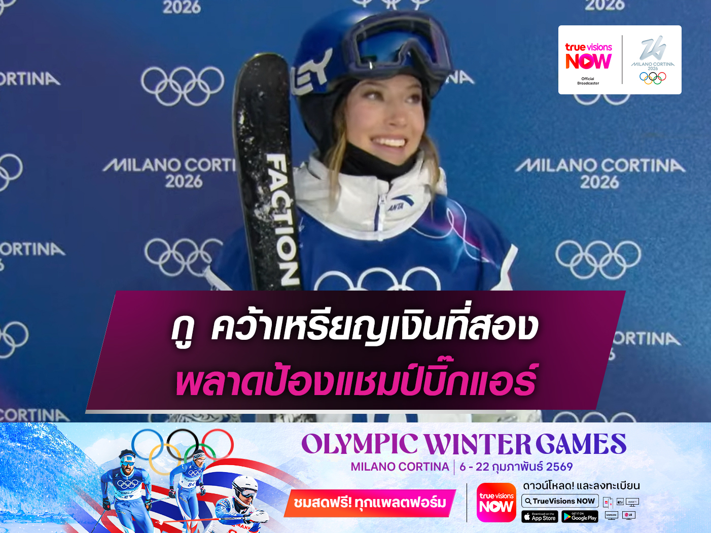 ไอลีน กู นักสกีสาวสวยทีมชาติจีนพลาดการป้องกันแชมป์ สกีฟรีสไตล์ บิ๊กแอร์หญิง ใน โอลิมปิกฤดูหนาว มิลาโน่ คอร์ติน่า 2026 เมื่อคืน 16 กุมภาพันธ์ที่ผ่านมา คว้าเหรียญเงินเป็นเหรียญที่สองในการแข่งขันครั้งนี้ ด้วยสกอร์รวมเป็นรอง เมแกน โอลด์แฮม จากแคนาดา