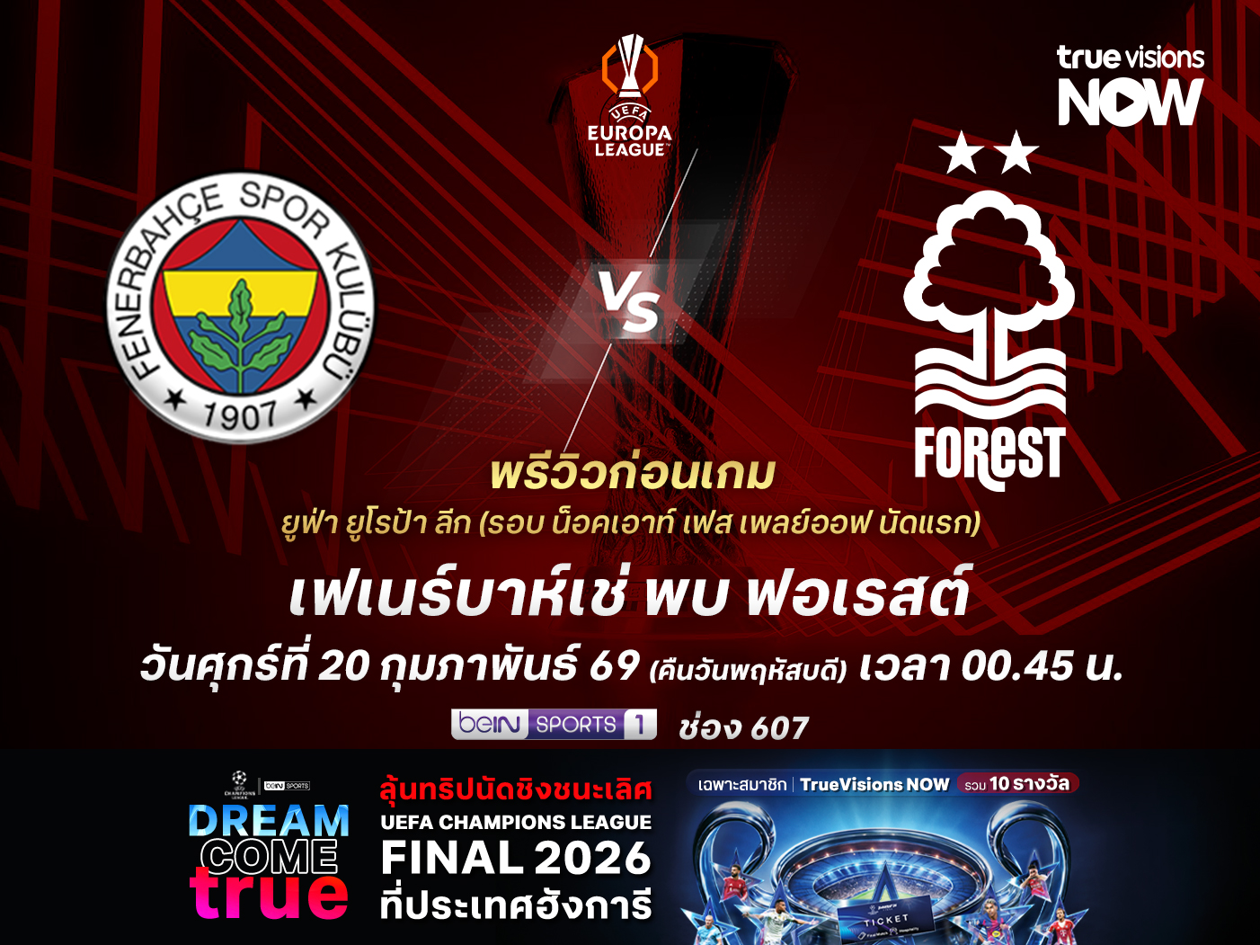 ศึก ยูฟ่า ยูโรป้า ลีก 2025-26 รอบ น็อคเอาท์ เฟส เพลย์ออฟ นัดแรก เฟเนร์บาห์เช่ จากตุรกี จะเล่นที่ ซูครู ซาราโจกลู สเตเดี้ยม รับการมาเยือนของ น็อตติ้งแฮม ฟอเรสต์ จากอังกฤษ โดยเกมนี้ เฟเนร์บาห์เช่ เจ้าถิ่น กำลังอยู่ในฟอร์มที่ยอดเยี่ยม หลังชนะไปถึง 19 จาก 28 นัดหลังสุดในทุกรายการ และแพ้ไปเพียง 2 เกมขณะที่ ฟอเรสต์ ฟอร์มแย่จนต้องเปลี่ยนโค้ชเป็นครั้งที่สองในซีซั่นนี้ แต่ดูแล้วก็อาจจะยังไม่สามารถเปลี่ยนแปลงอะไรได้ในทันที ทำให้เกมนี้พวกเขามีโอกาสแพ้มากกว่าจะมีแต้มกลับออกไป
