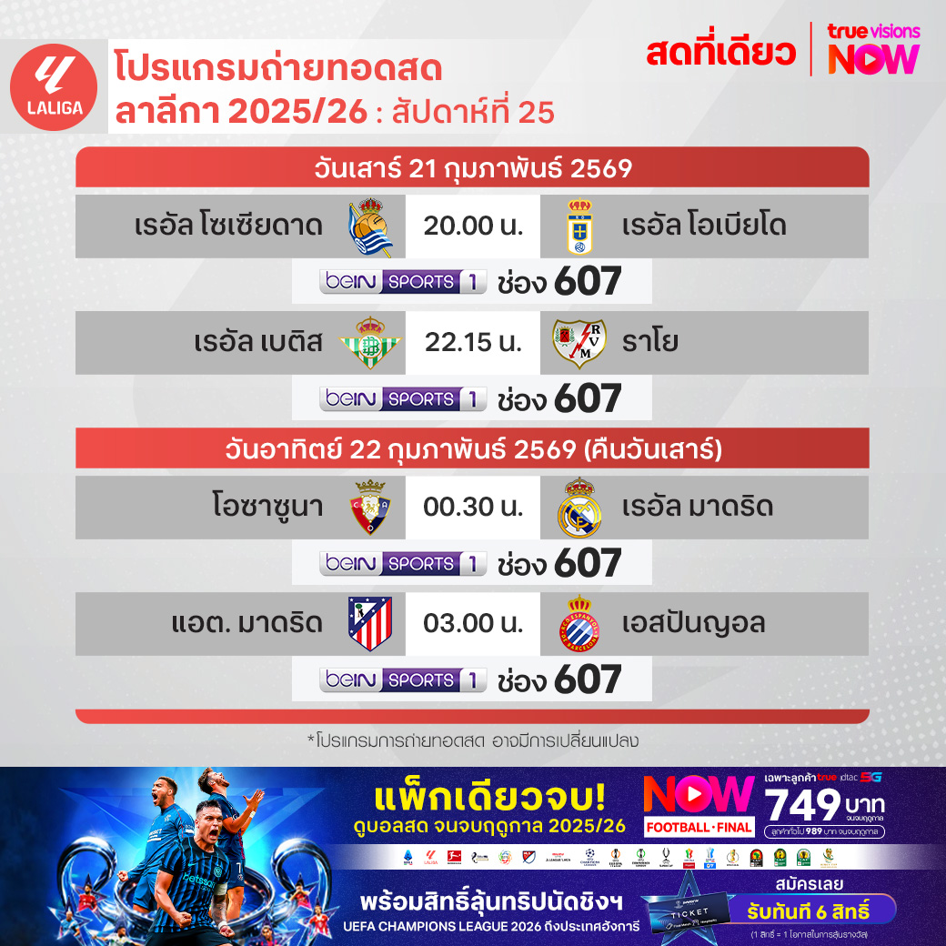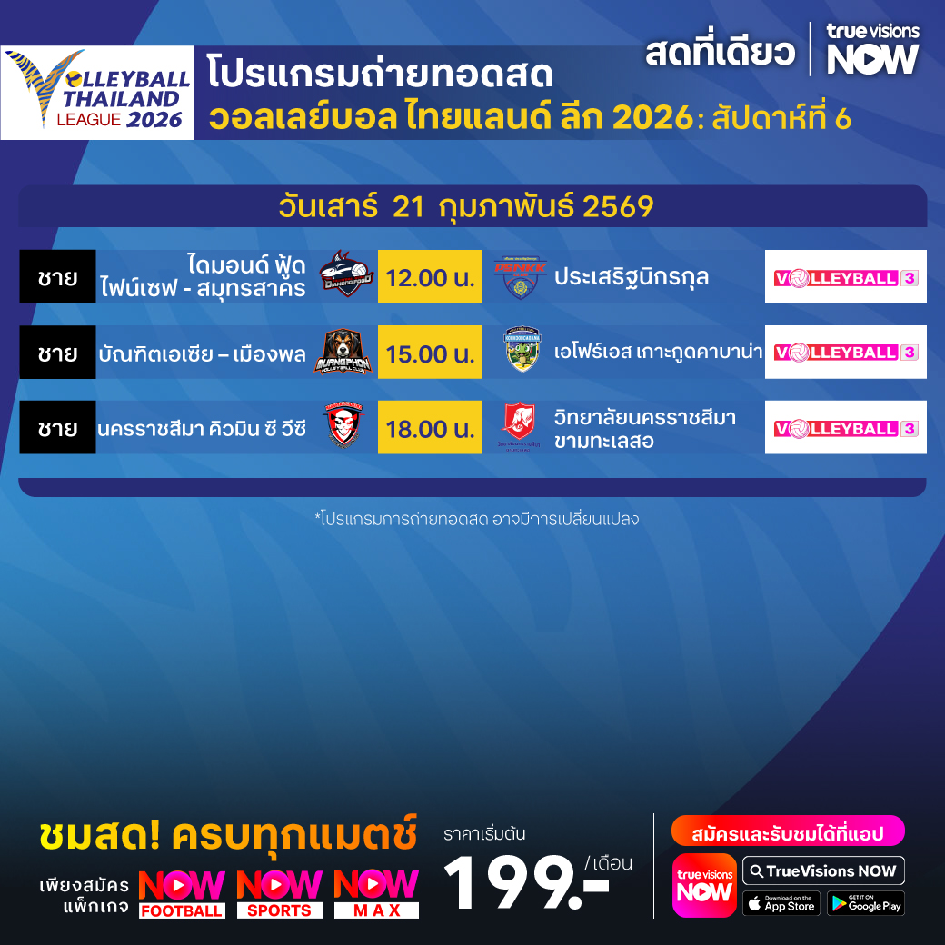วันนี้มีอะไรดูที่ ทรูวิชั่นส์ ประจำวันเสาร์ที่ 21 กุมภาพันธ์ 69 ยังคงมีกีฬาที่น่าสนใจให้ได้ตามลุ้นตามเชียร์กันเหมือนเดิม โดยในส่วนของฟุตบอลยังมีศึก ลา ลีกา สเปน, บุนเดสลีกา เยอรมนี, กัลโช่ เซเรีย อา อิตาลี, สกอตติช พรีเมียร์ชิพ, ลีกา 2 เยอรมนี, เอ-ลีก ออสเตรเลีย และ ซาอุดิ โปร ลีก ให้ได้ตามเชียร์กันต่อ ส่วนกีฬาอื่นๆ ยังมีการแข่งขันโอลิมปิกฤดูหนาว 2026, ซูเปอร์ไบค์ เวิลด์ แชมเปี้ยนชิพ, เทนนิสหญิง ดับเบิ้ลยูทีเอ ทัวร์ รายการ ดูไบ แชมเปี้ยนชิพส์, เวิลด์ สนุกเกอร์ ทัวร์ รายการ เพลย์เยอร์ส แชมเปี้ยนชิพ, ยูเอฟซี ไฟต์ ไนท์, รักบี้ ซิกซ์ เนชั่นส์, มวยไทย ดิ อัลติเมท มวยไทย เอ็กซ์พีเรียนซ์, วอลเลย์บอล วี-ลีก และ วอลเลย์บอล ไทยแลนด์ ลีก งานนี้ ทรูวิชั่นส์ จัดเต็มให้ชมกันถึงบ้าน