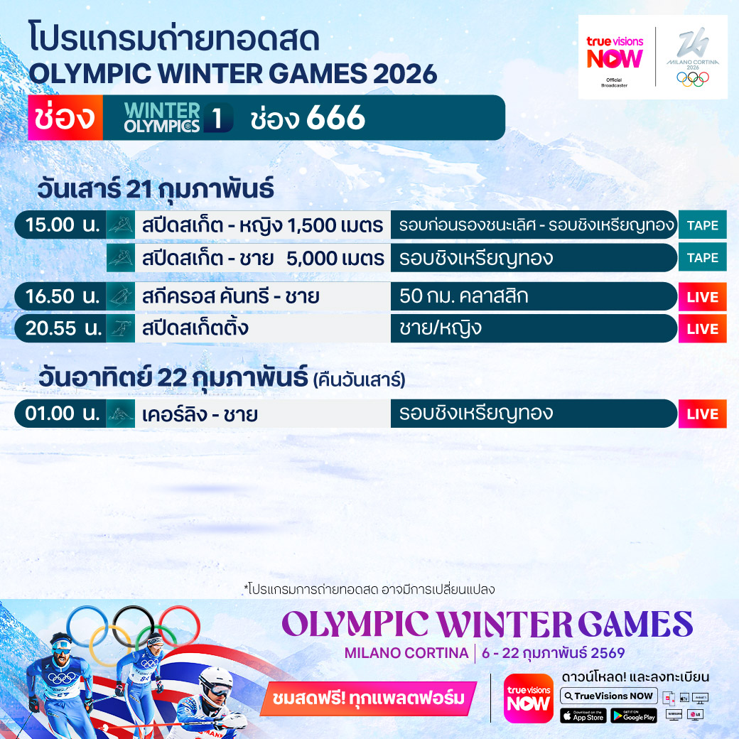 15:00 สปีดสเก็ต - หญิง 1,500 เมตร รอบก่อนรองฯ / รอบชิงเหรียญทอง, ชาย 5,000 เมตร รอบชิงเหรียญทอง TAPE
