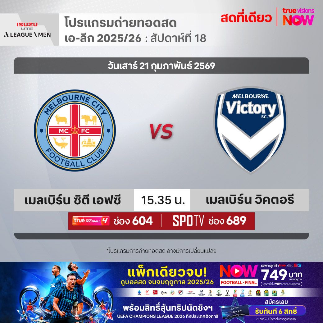 Melbourne City FC vs Melbourne Victory เวลา 15.35-17.35 ทางช่องTPF 4(604) / SPOTV (689)