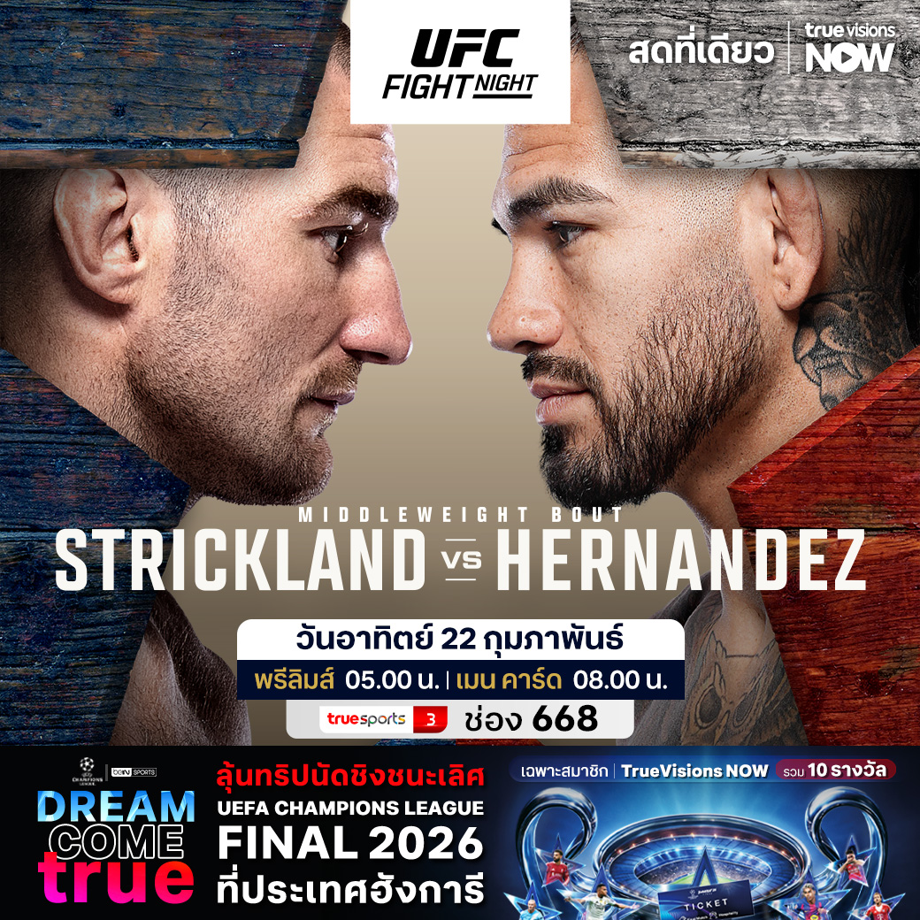 ยูเอฟซี ไฟต์ ไนท์ สัปดาห์นี้ ไปกันที่ โตโยต้า เซนเตอร์ ในเมืองฮิวสตัน รัฐเท็กซัส คู่เอก รุ่นมิดเดิ้ลเวต ฌอน สตริคแลนด์ อดีตแชมป์ชาวอเมริกัน ในฐานะรองแชมป์อันดับ 3 พบกับรองแชมป์อันดับ 4 เพื่อนร่วมชาติ แอนโทนี่ เฮอร์นานเดซ ร่วมด้วยรุ่นเฟเธอร์เวต แดน อิเก้ ขาลุยชาวอเมริกัน ท้าประลองนักสู้บราซิล เมลคีซาอิล คอสค้า