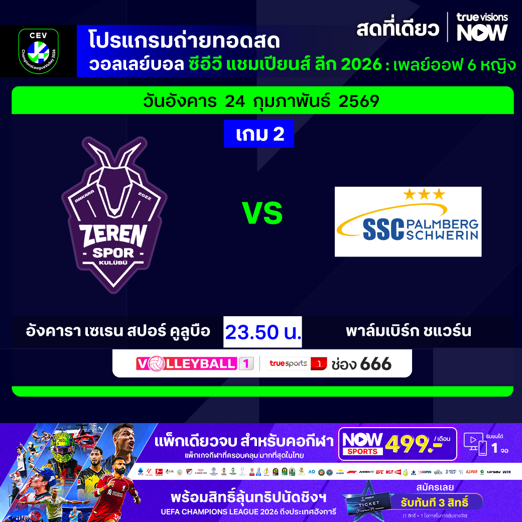 อังคารา เซเรน สปอร์ คูลูบือ พบ พาล์มเบิร์ก ชแวร์น เวลา 23.50 ทางช่อง Volleyball 1/TS 1 (666)