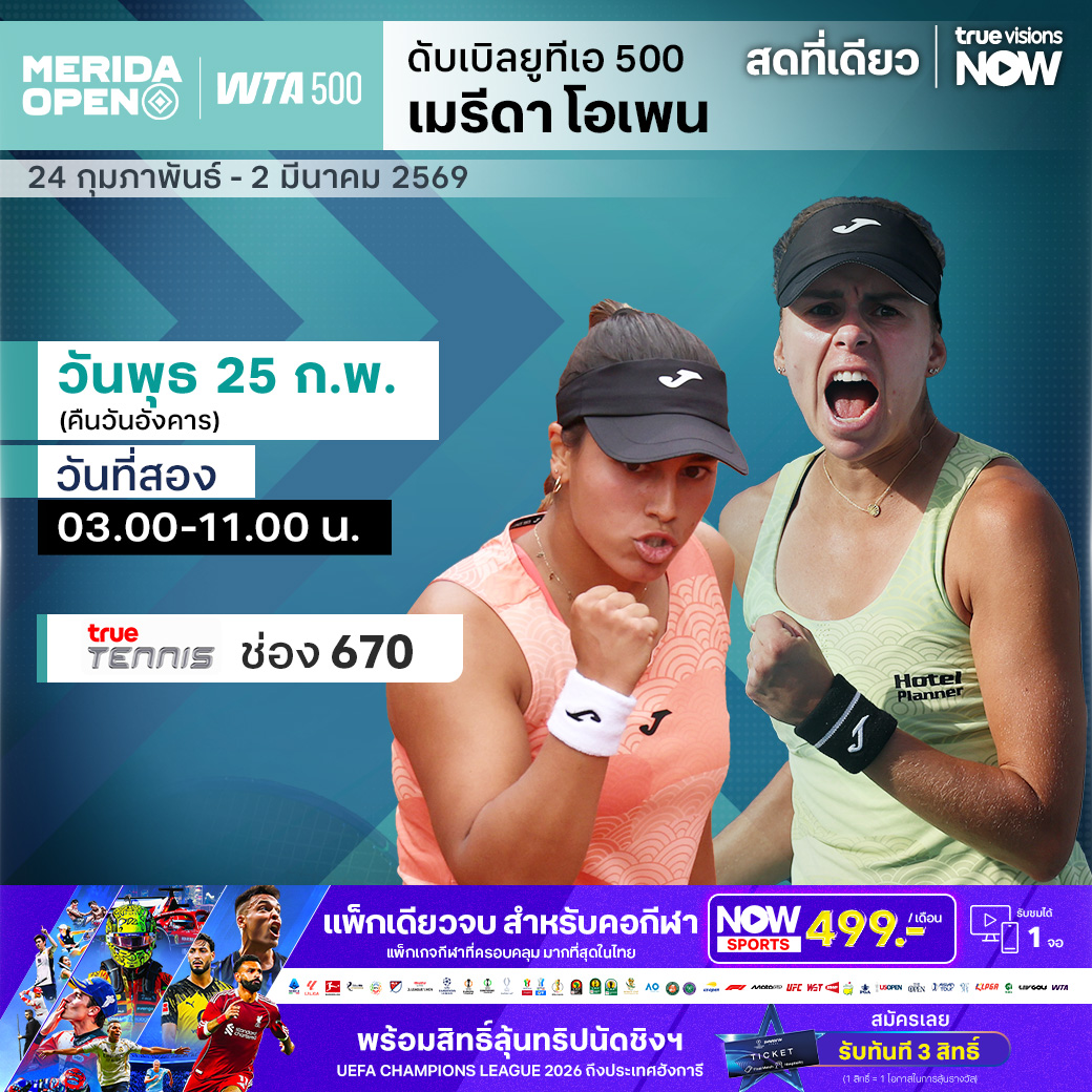 เทนนิสหญิง ดับเบิ้ลยูทีเอ ทัวร์ สัปดาห์นี้พบกับรายการ เมริด้า โอเพ่น รายการระดับ WTA 500 เป็นรายการแรกก่อนเข้าสู่ช่วง Sunshine Double ในเดือนมีนาคม โดยรายการนี้จัดการแข่งขันที่ประเทศเม็กซิโก บรรดานักเทนนิสหญิงระดับโลกเข้าร่วมการแข่งขันกันคับคั่ง ร่วมลุ้นว่าใครจะคว้าแชมป์ไปครองได้สำเร็จ ชมสด ครบทุกรอบ ที่ ทรูวิชั่นส์